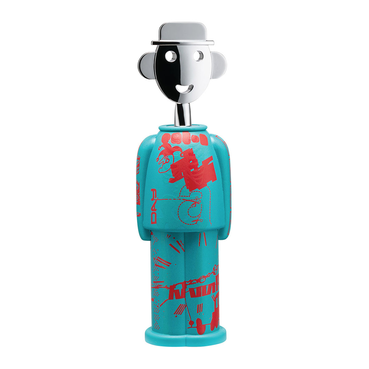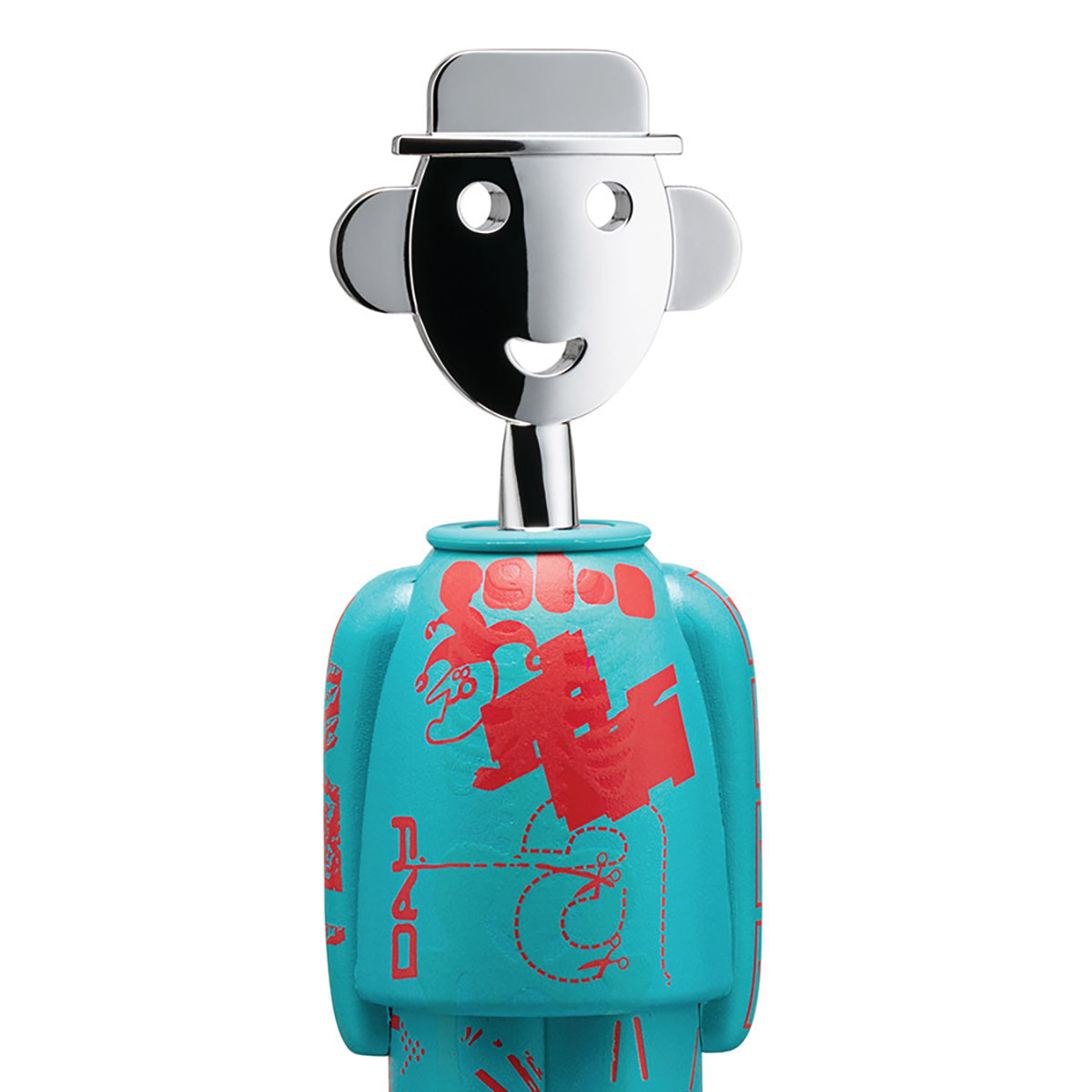 Le trio créatif de Studio Temp s’inspire du street art pour proposer une interprétation contemporaine de ce tire-bouchon d’Alessandro Mendini. Les graphismes reflètent une empreinte personnelle mêlant signalisation et protection des données. En hommage au père d’un designer radiologue, des éléments phosphorescents apparaissent dans l’obscurité, créant une juxtaposition surprenante de références et de souvenirs.