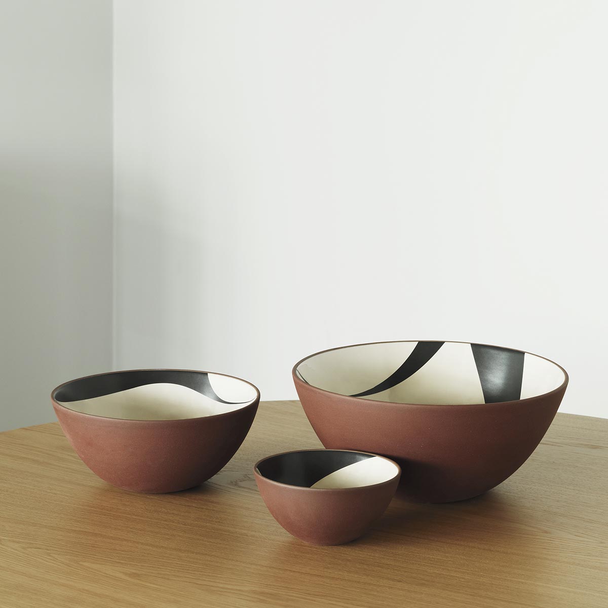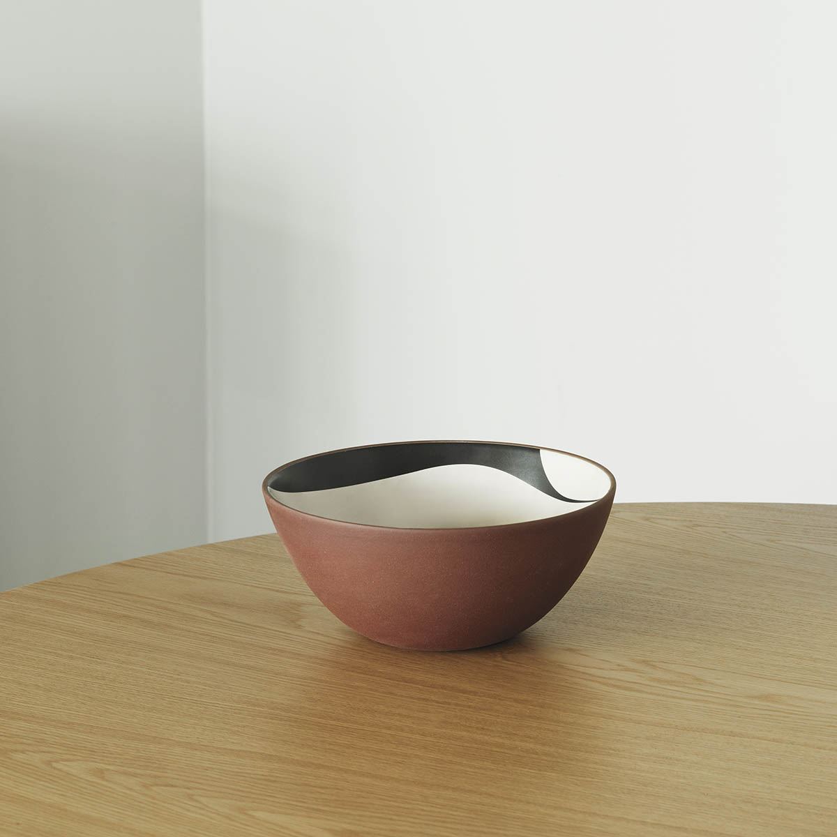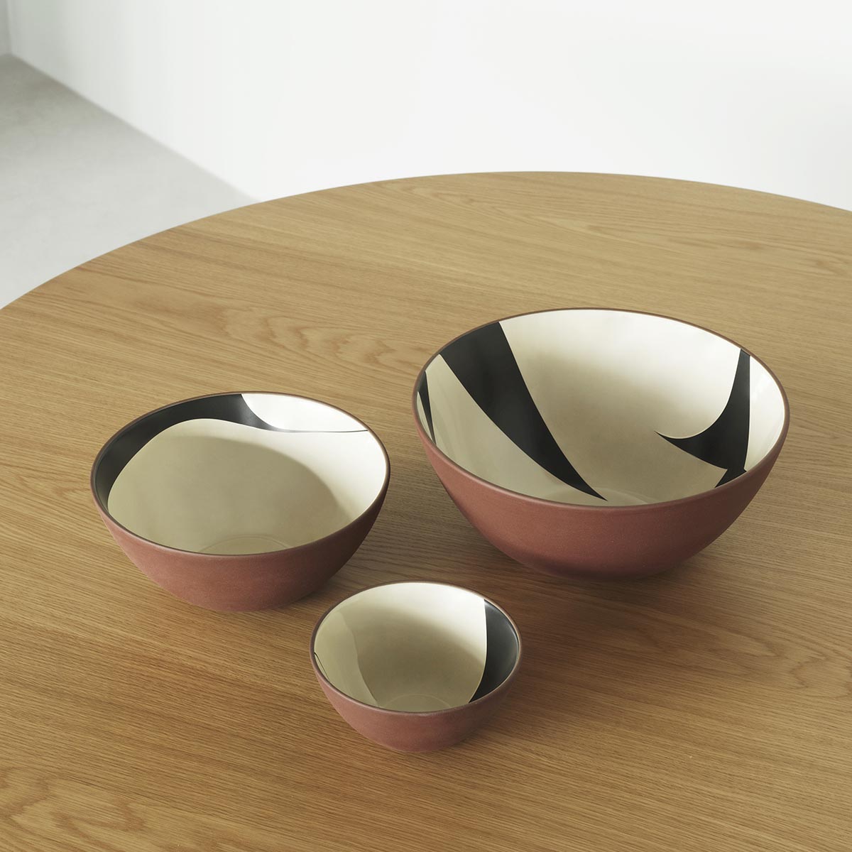 Les bols Line sont fabriqués à partir d’argile rouge et sont ornés de ravissants motifs imprimés en noir et crème. Les bols Line présentent un design harmonieux, qui associe une forme classique et minimaliste à des motifs géométriques attrayants. L’interaction particulière entre l’extérieur en argile rouge et l’intérieur décoré d’un imprimé incarne l’essence de l’esthétique irrésistible des bols Line. En raison de leur processus de fabrication, chaque bol est unique.