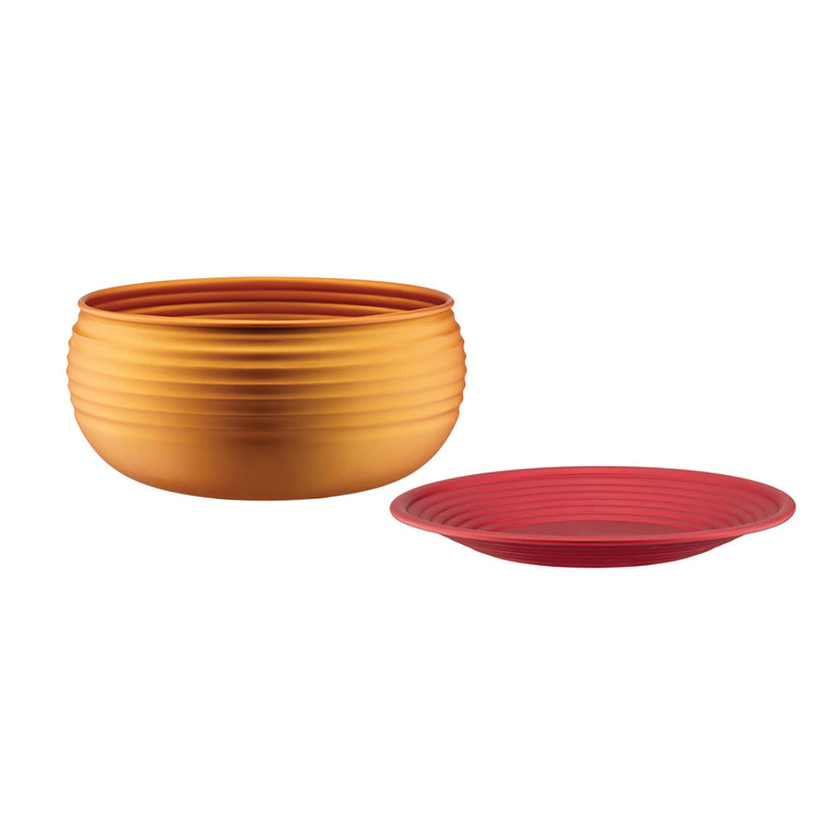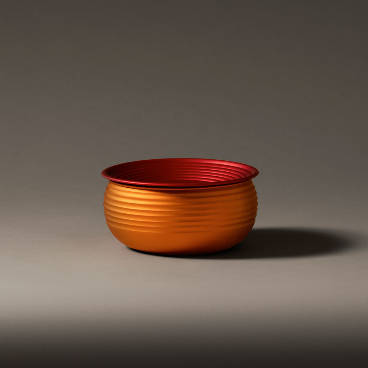 • Matière : récipient en aluminium anodisé orange, plateau en aluminium anodisé rouge
