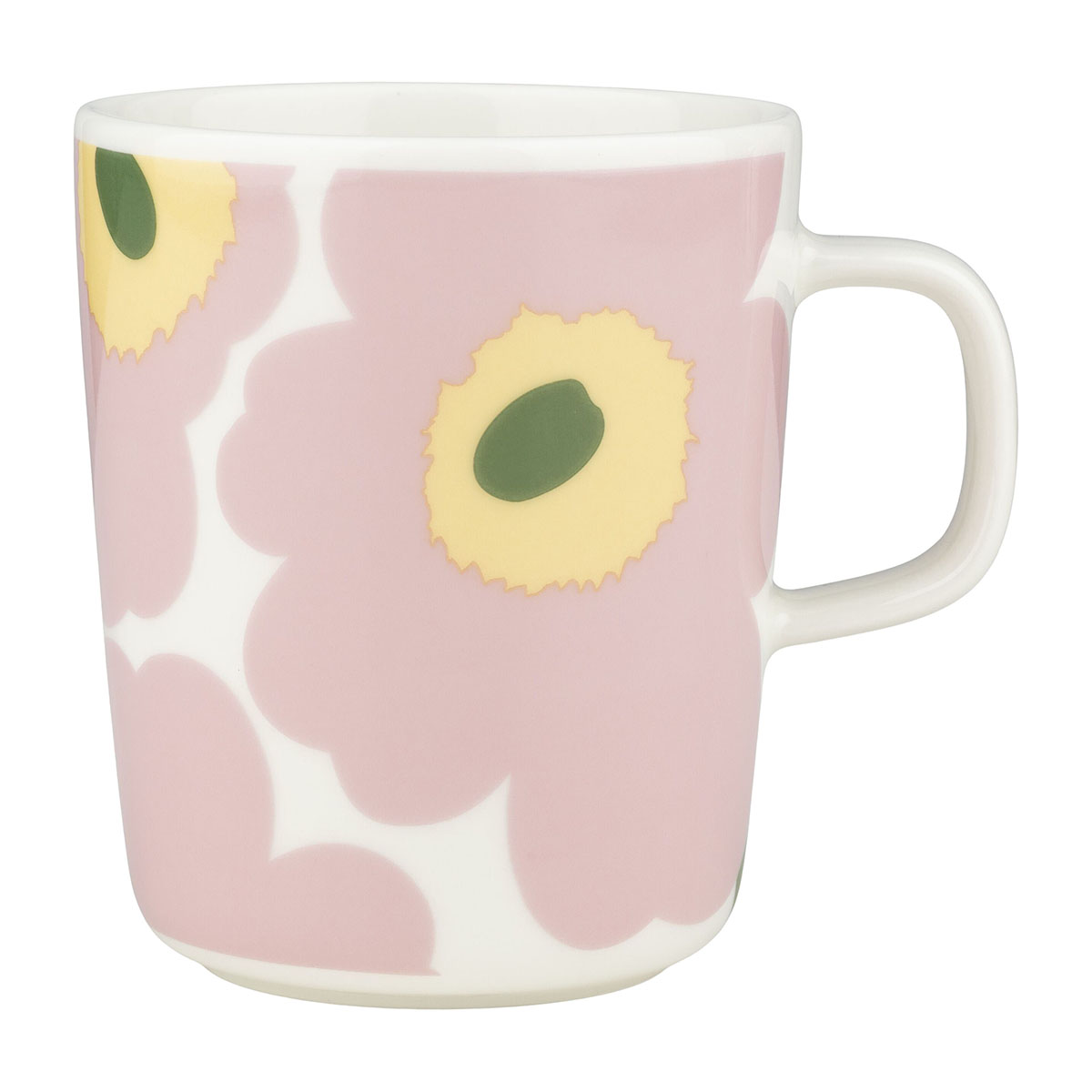 Ce Mug Oiva est fabriqué en céramique blanche et arbore le motif Unikko blanc, rose, jaune clair, vert.