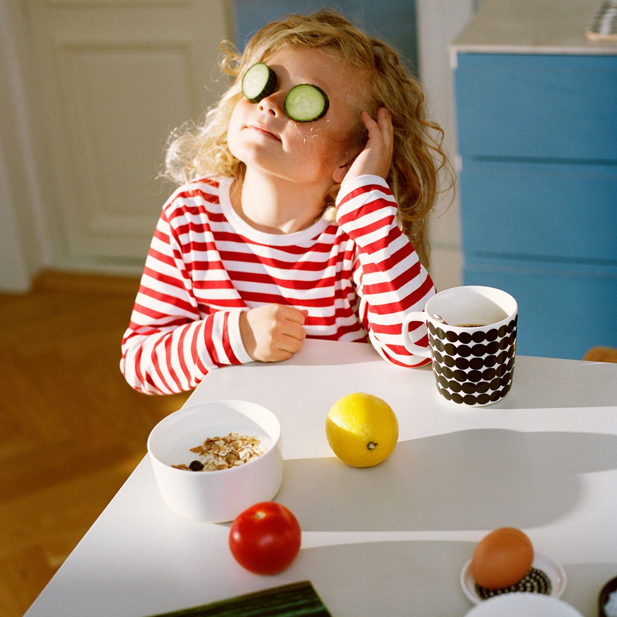 Cette tasse Oiva est décorée du motif Räsymatto. Elle est en grès blanc qui va au lave-vaisselle, au four, au micro-ondes et au congélateur.
