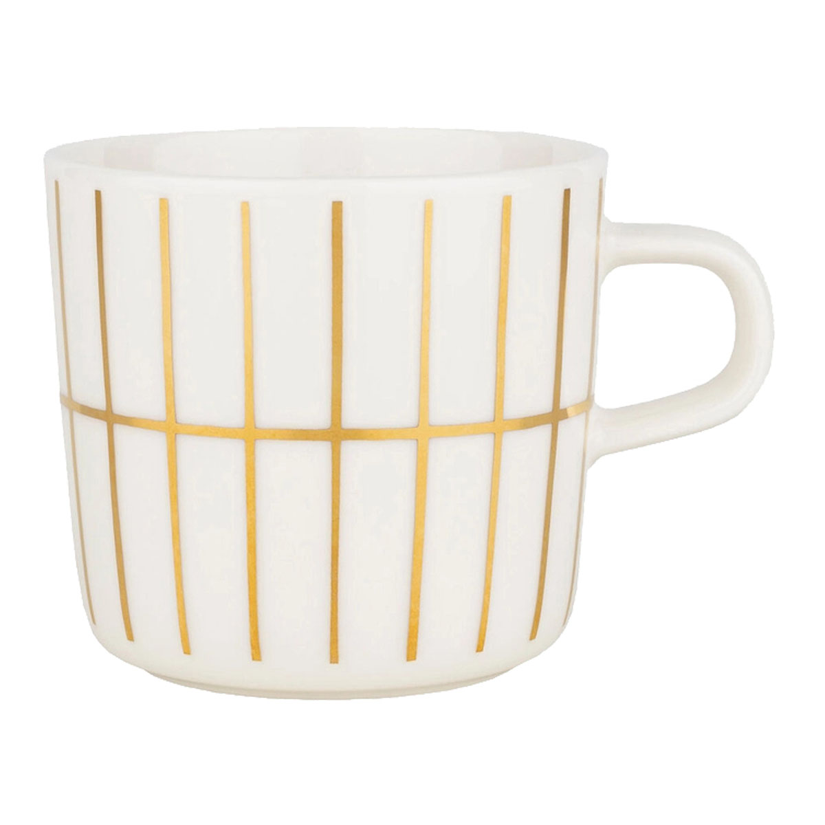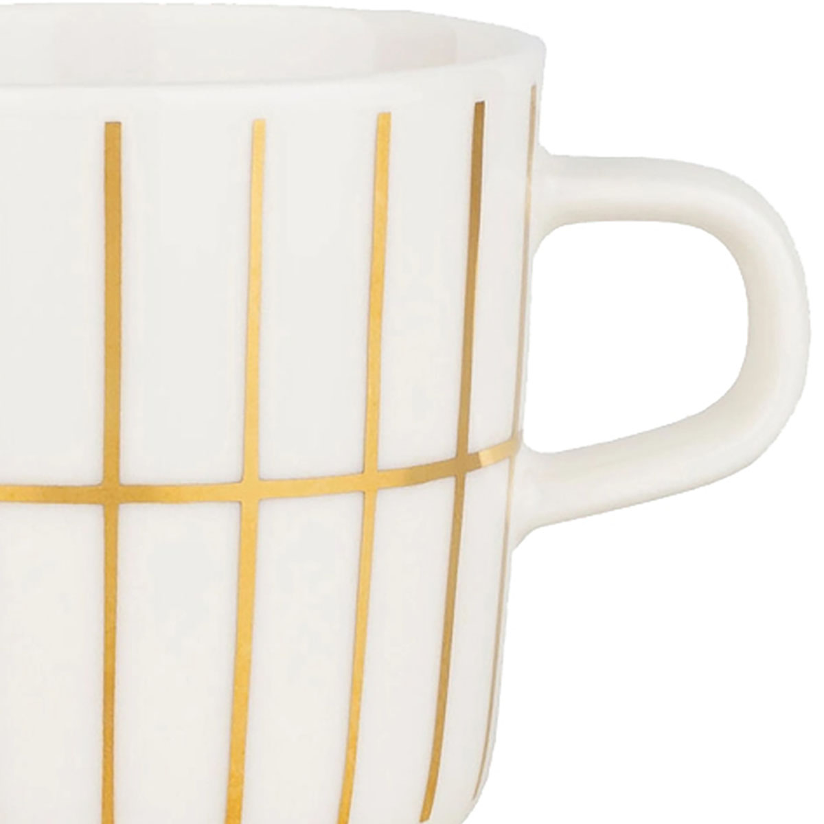 La tasse à café Oiva est en grès blanc et présente le motif Tiiliskivi doré imprimé avec un pigment métallique. En raison des détails métalliques, nous vous recommandons de laver ce produit à la main.