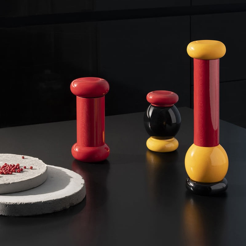 Indispensable dans toute cuisine et à table pour les repas quotidiens, ce moulin imaginé par Ettore Sottsass, reprend les volumes colorés superposés typiques de son style.