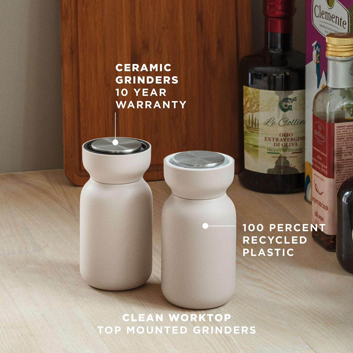 Un design simple et fonctionnel : Une silhouette arrondie, des couleurs discrètes et une forme qui tient naturellement dans la main. La large ouverture facilite le remplissage du moulin et les couleurs distinctes permettent de différencier facilement le sel et le poivre.