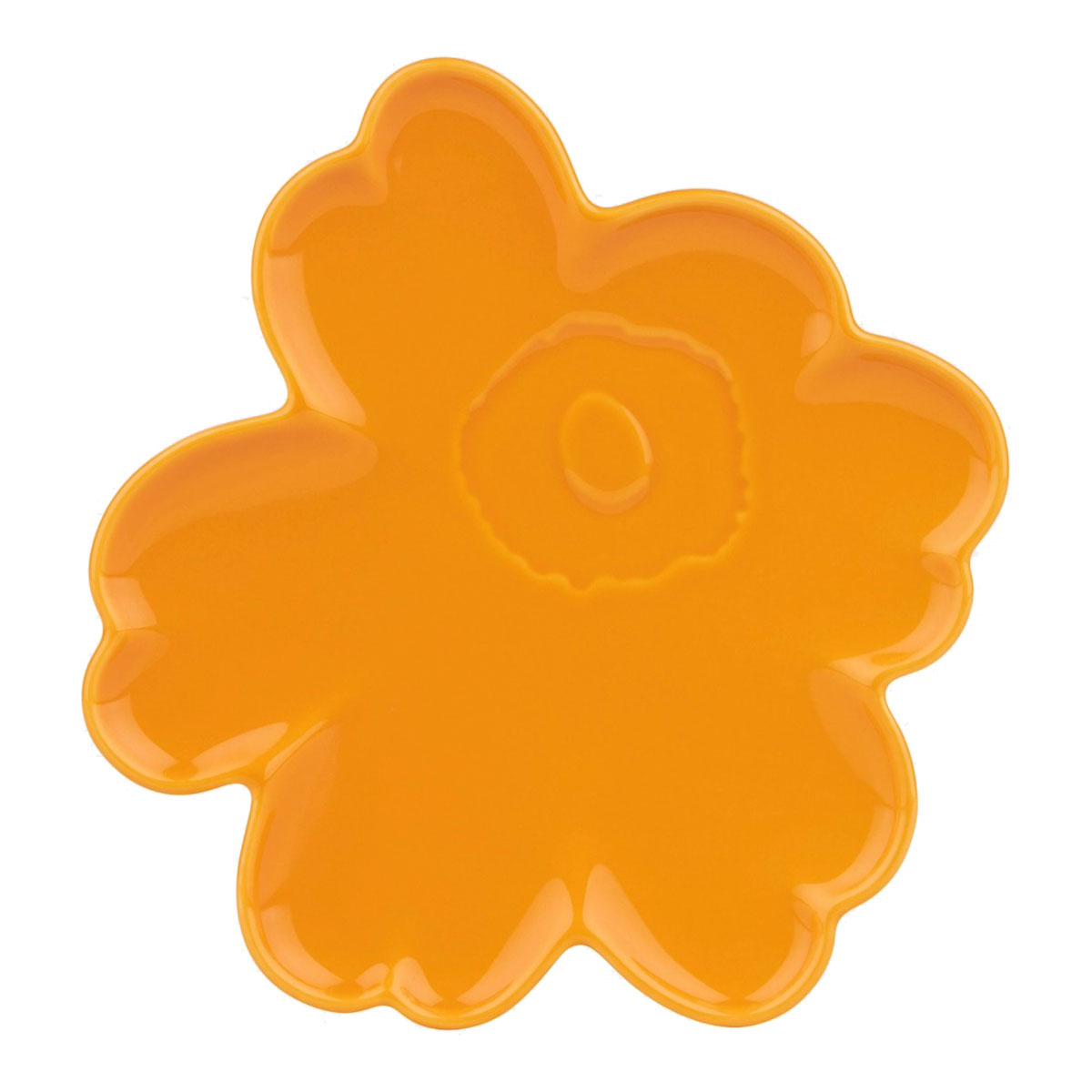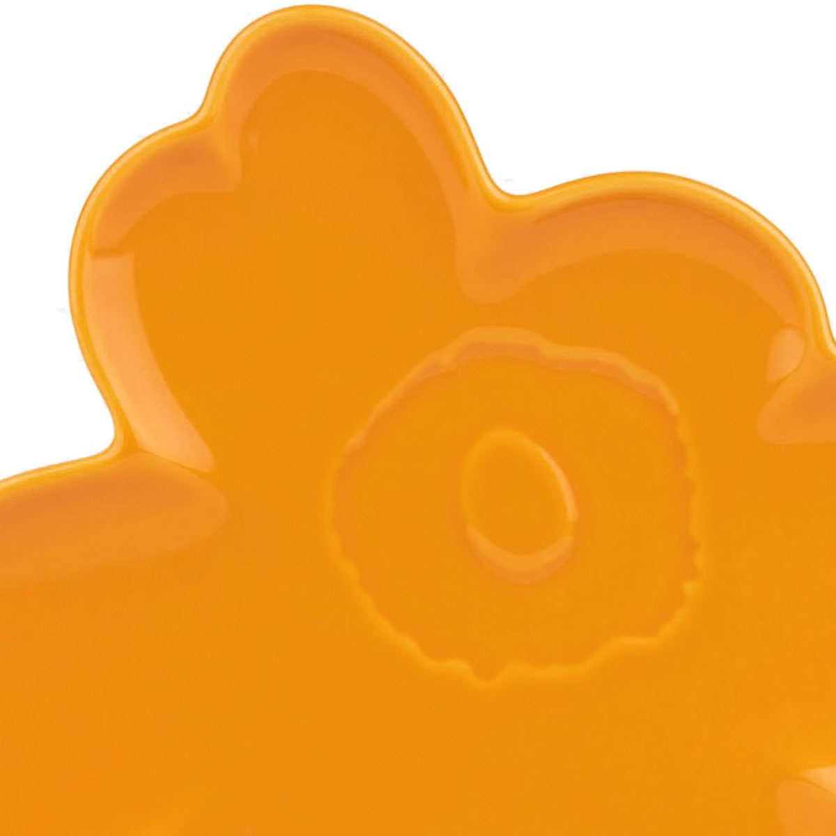 L’assiette 20cm Unikko en forme de fleur est en céramique émaillée jaune-orange.