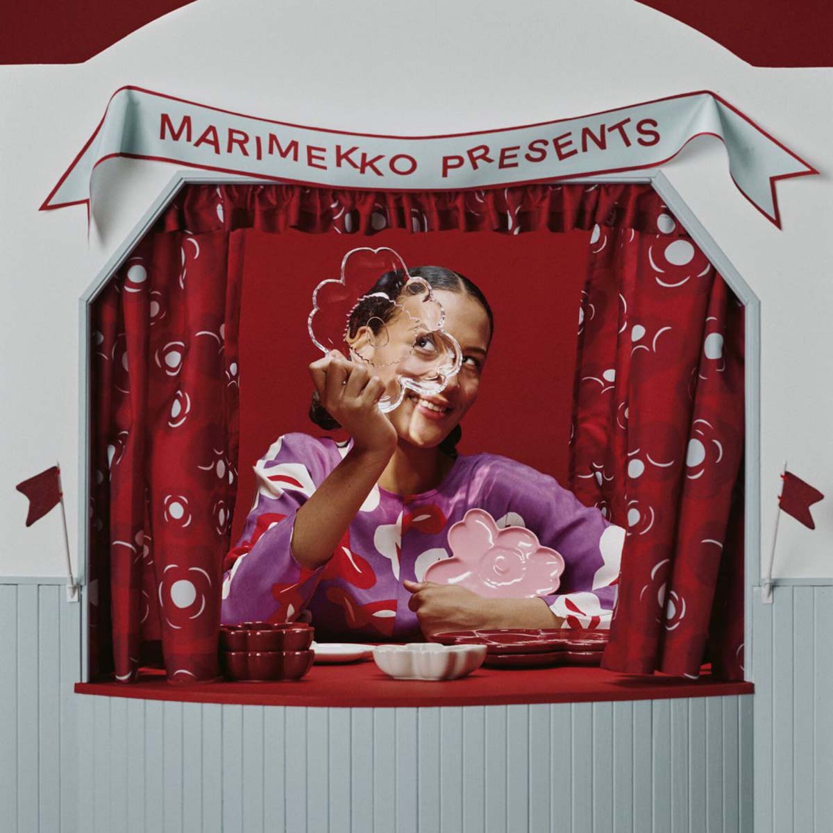 Le plat de service est emballé dans une boîte ornée du logo Marimekko.