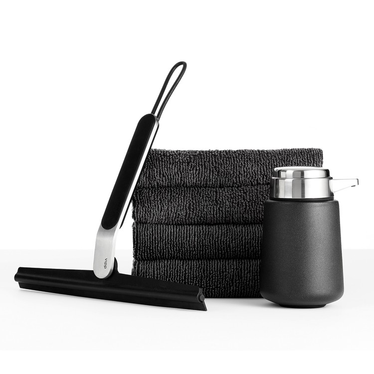 Sa poignée en acier et en caoutchouc repose bien dans la main, ses bords souples protègent le verre et le carrelage, et la sangle intégrée facilite sa suspension après son utilisation.