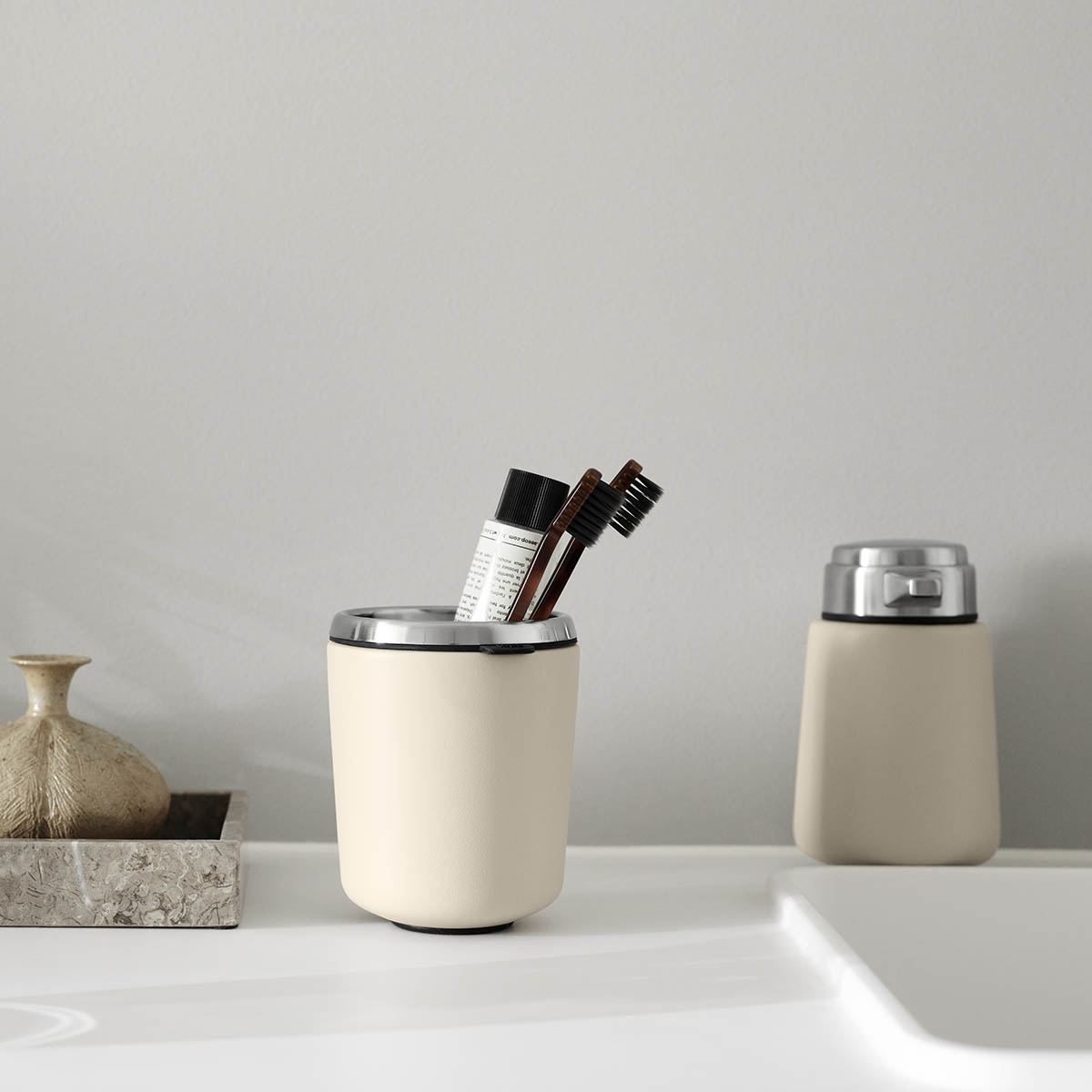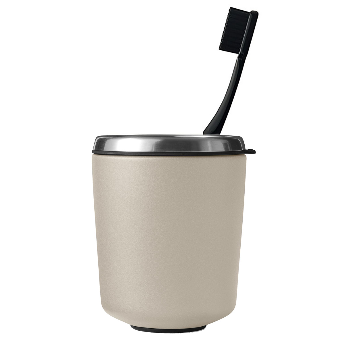 Le porte-brosse à dents est divisé en deux compartiments. La base en caoutchouc souple protège les surfaces de la salle de bains. Toutes les parties en caoutchouc résistent au lave-vaisselle.