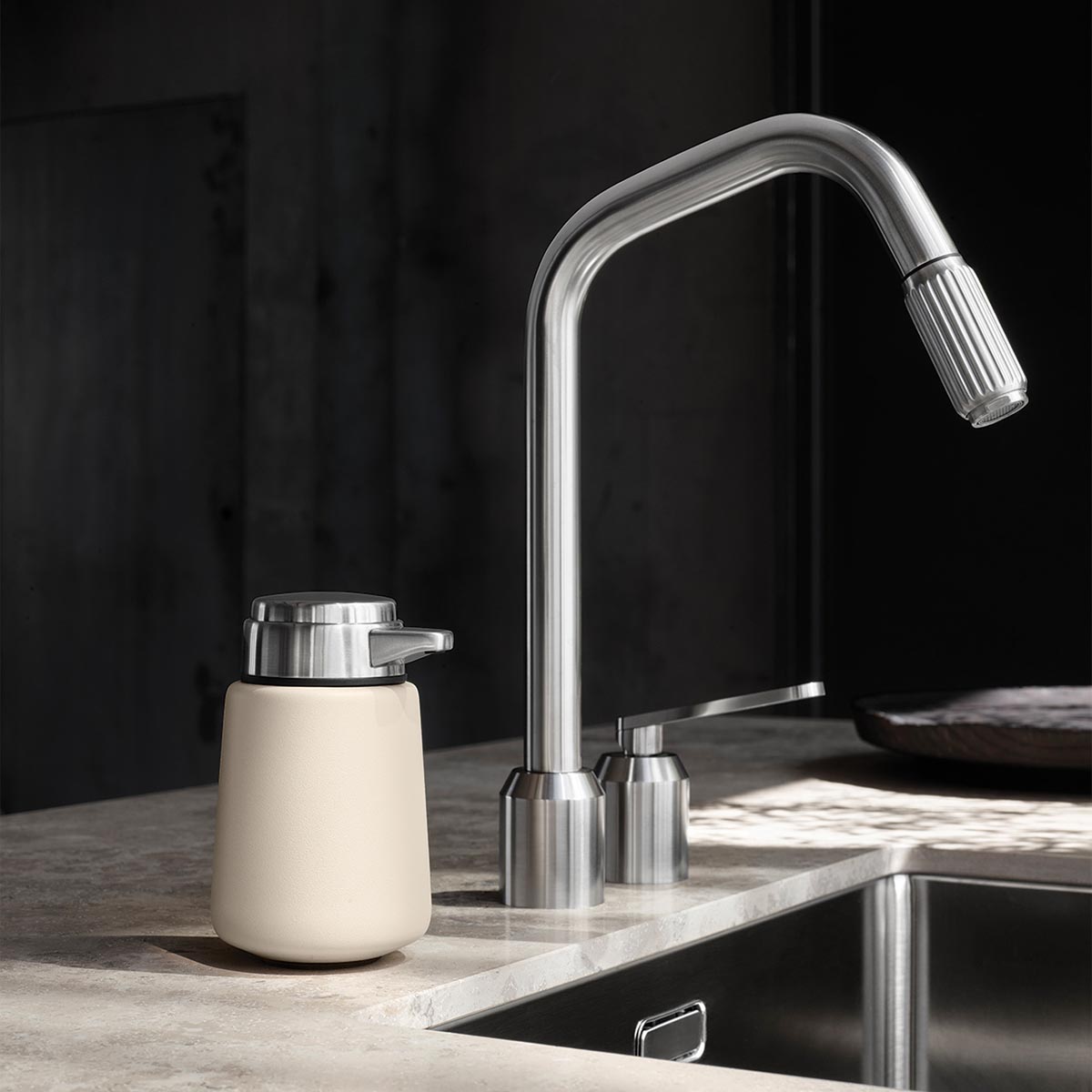 Le distributeur de savon Vipp est un classique moderne en acier inoxydable et caoutchouc. La pompe spéciale avec sortie de savon fixe assure une prise confortable. La base en caoutchouc garantit la stabilité et protège les surfaces sensibles.