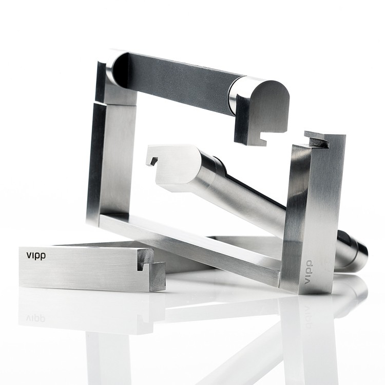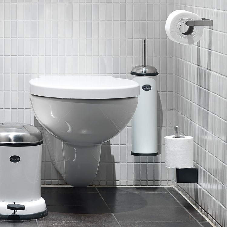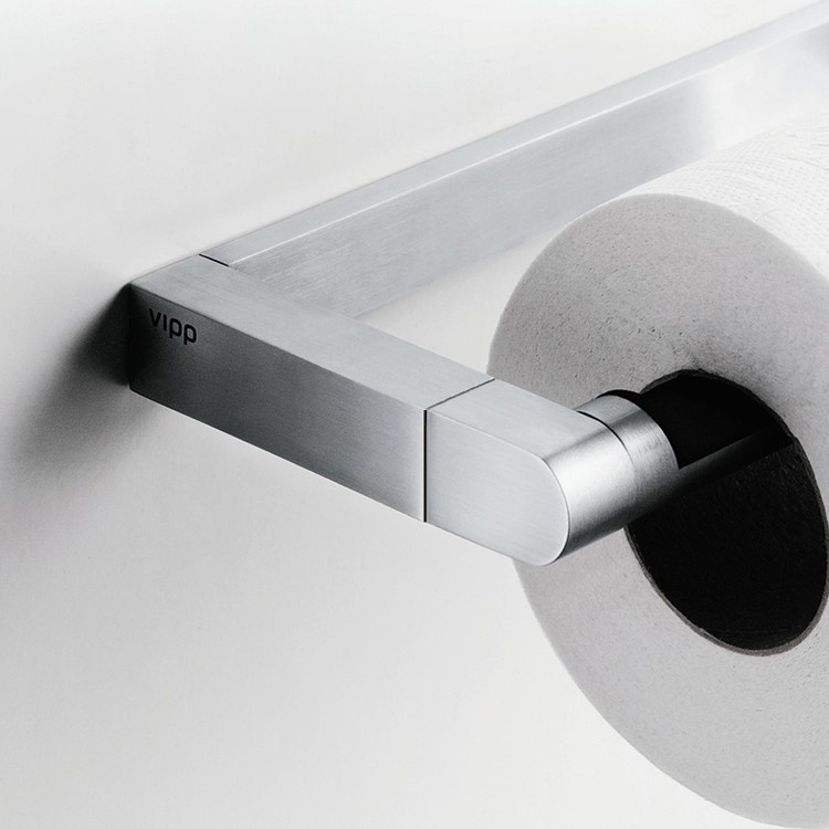 Le porte-rouleau de papier toilette de Vipp est en acier inoxydable et caoutchouc noir, anti-dérapant.L 17cm, prof. 8.5cm.