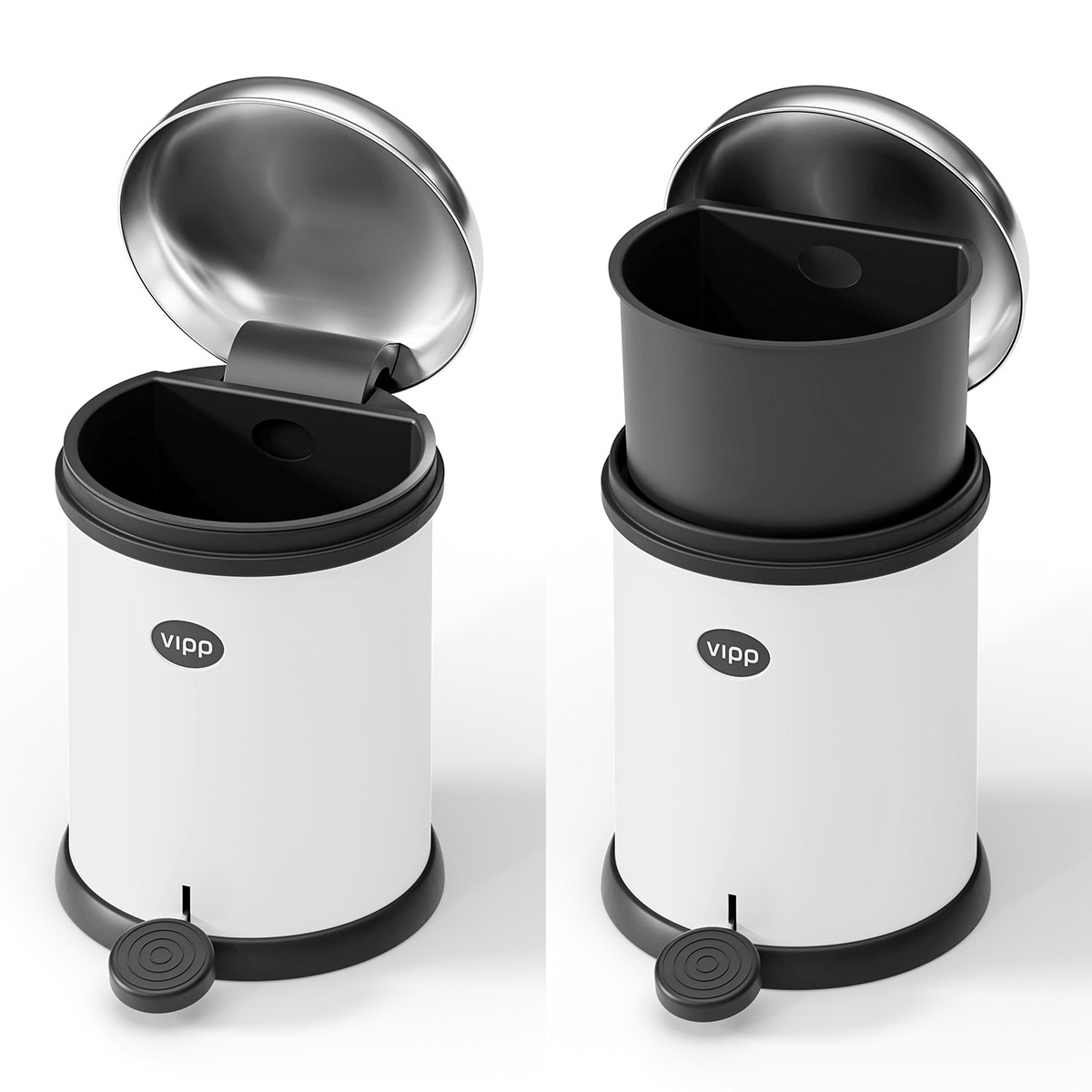 La plus petite et la plus compacte poubelle de Vipp allie fonctionnalité et design. C’est une poubelle à pédale de 3 litres, haute de 25 cm, conçue pour les petits espaces comme les chambres d’hôtel, les toilettes de bureau, les appartements en ville et les salles de bains invités.