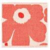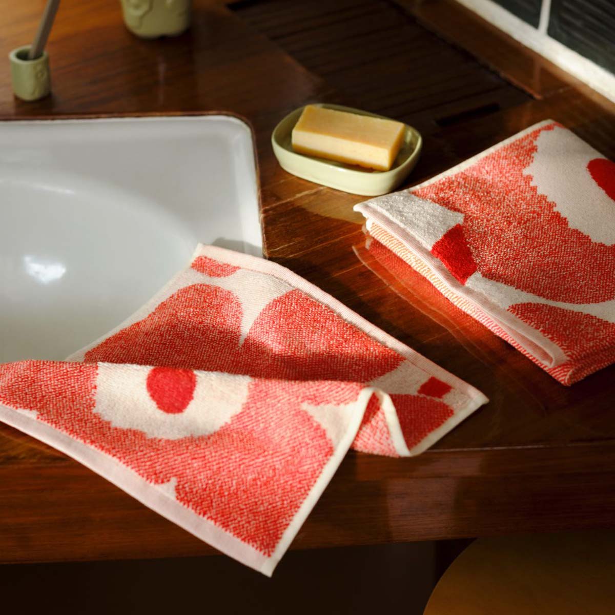 Cette collection de linges de bain est fabriquée en coton éponge 100% biologique. Le motif unikko est décliné dans une couleur naturelle de coton et de rouge-orange. Les linges ont deux différentes faces de part leur fabrication : une face où la couleur est dominante en est l’opposé sur l’autre face.