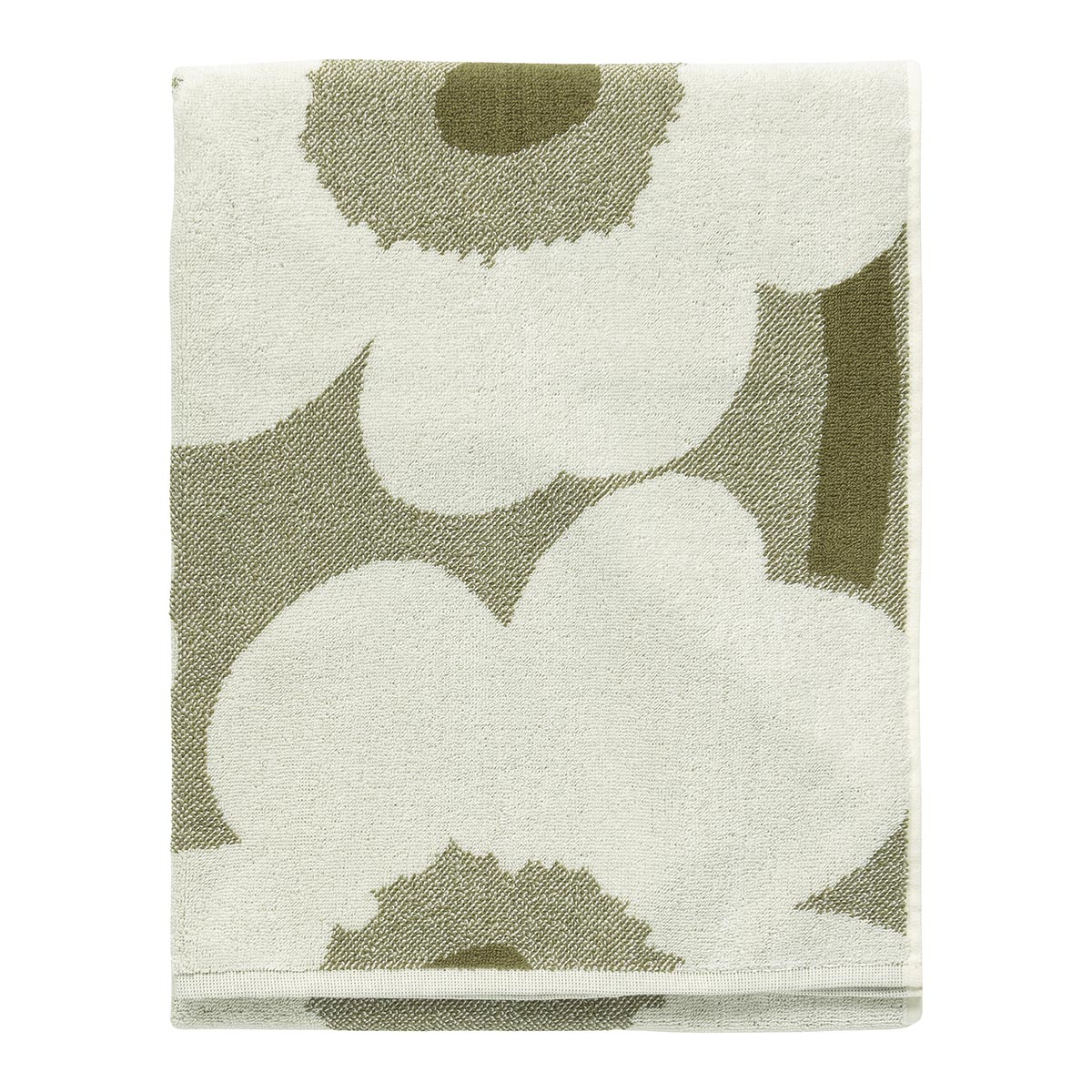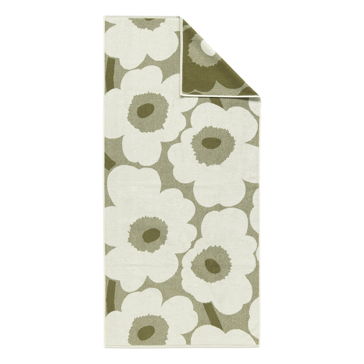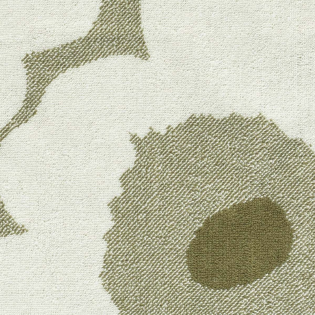 Le linge pour invités au motif Unikko est en éponge de coton biologique. Les couleurs du motif sont inversées de l’autre côté de la serviette.