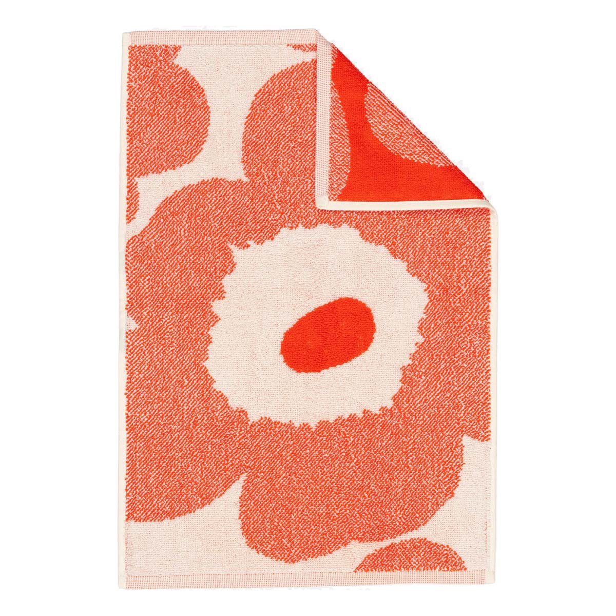 Cette collection de linges de bain est fabriquée en coton éponge 100% biologique. Le motif unikko est décliné dans une couleur naturelle de coton et de rouge-orange. Les linges ont deux différentes faces de part leur fabrication : une face où la couleur est dominante en est l’opposé sur l’autre face.