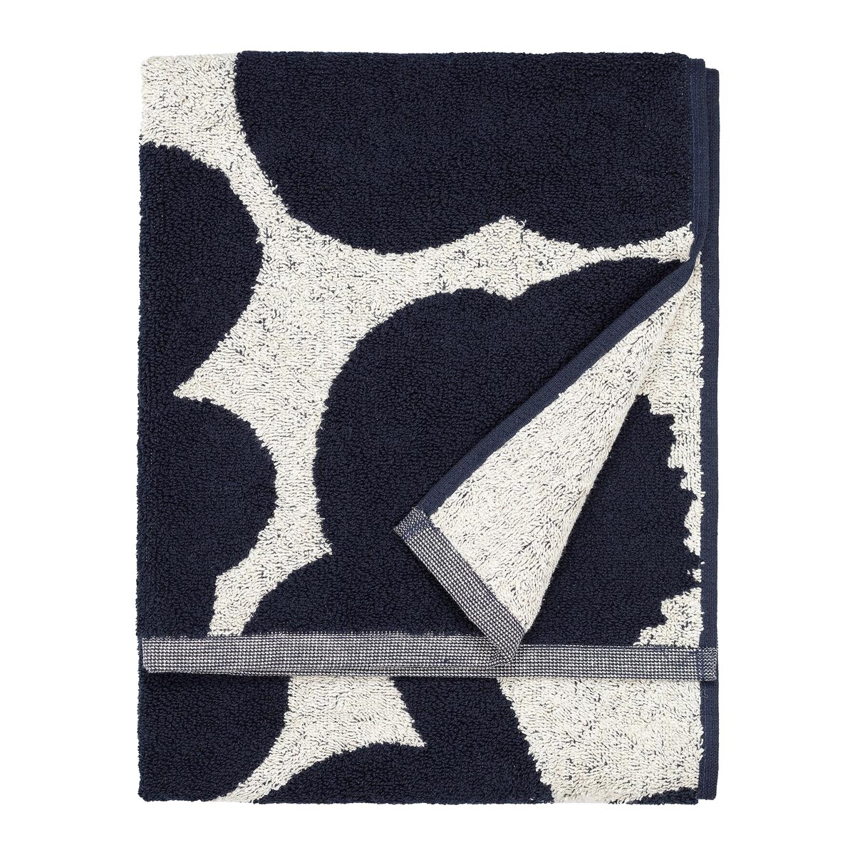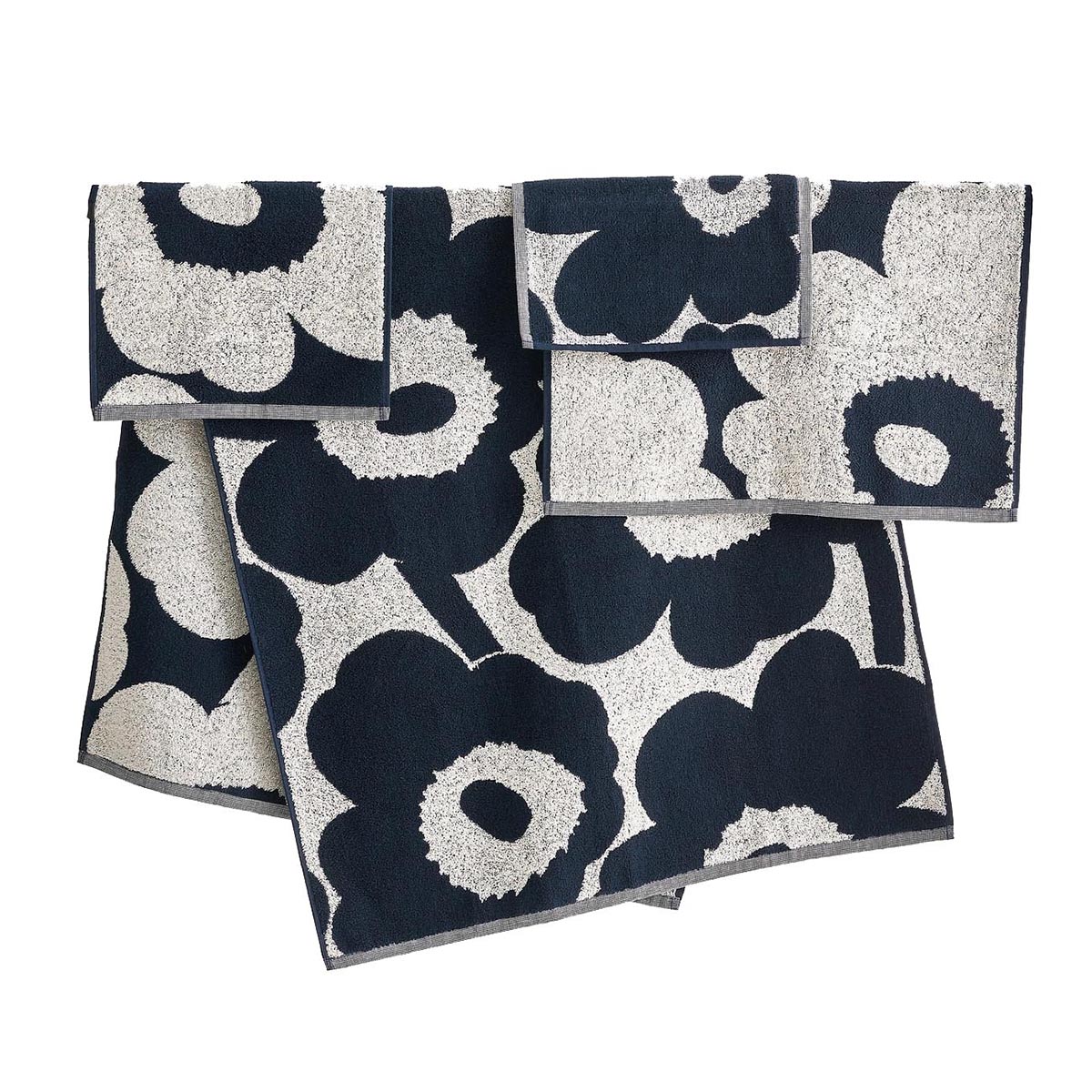 Cette collection de linges de bain est fabriquée dans un mélange de coton et de lin. Le motif unikko est décliné dans une couleur naturelle de coton et de bleu foncé. Les linges ont deux différentes faces de part leur fabrication : une face où la couleur est dominante en est l’opposé sur l’autre face.