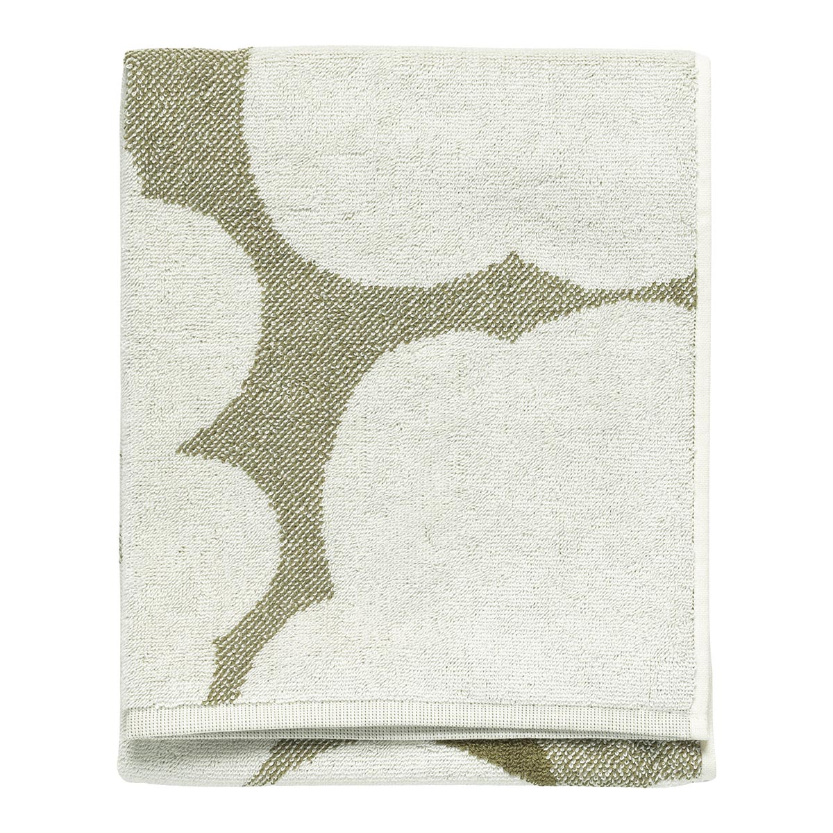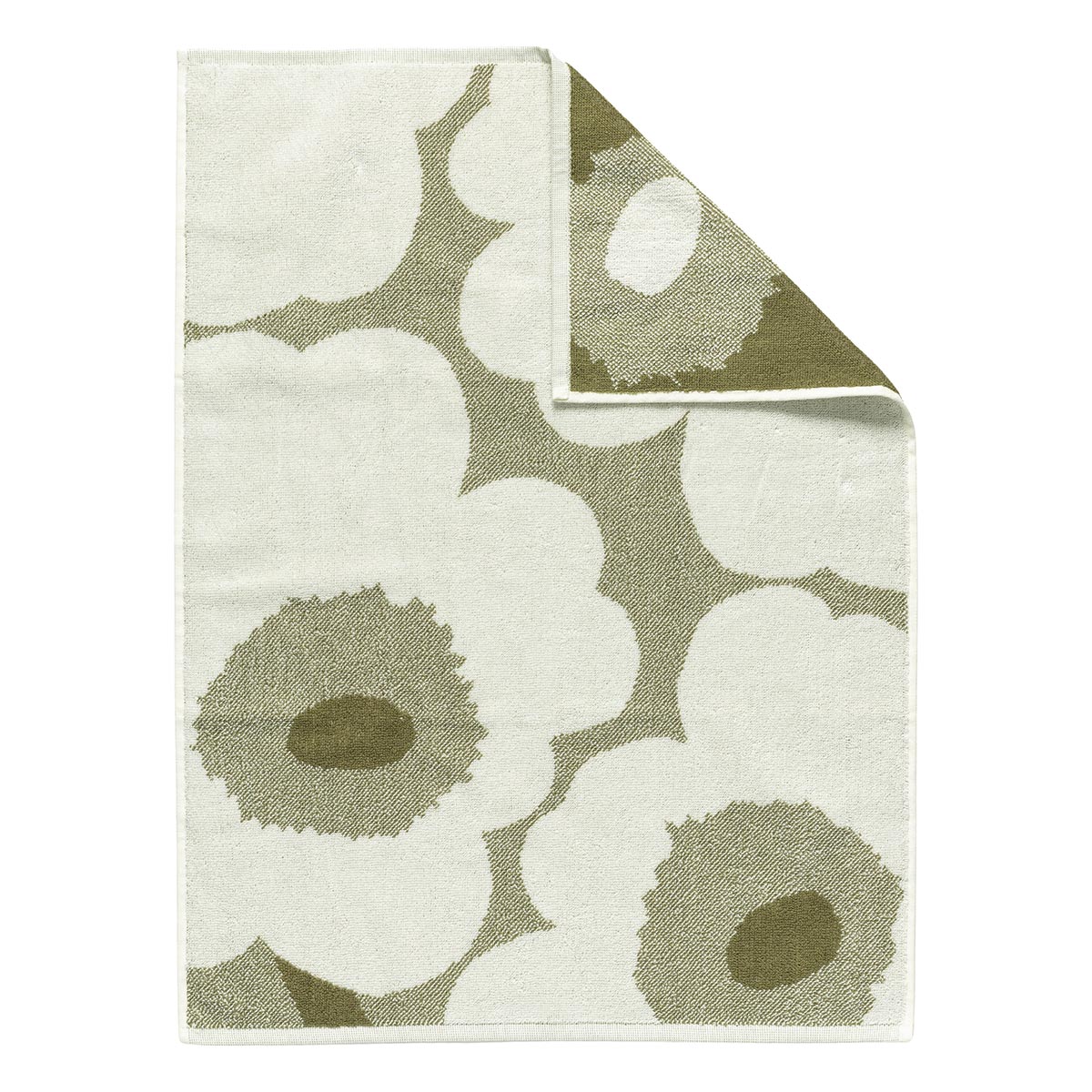 Le linge pour invités au motif Unikko est en éponge de coton biologique. Les couleurs du motif sont inversées de l’autre côté de la serviette.