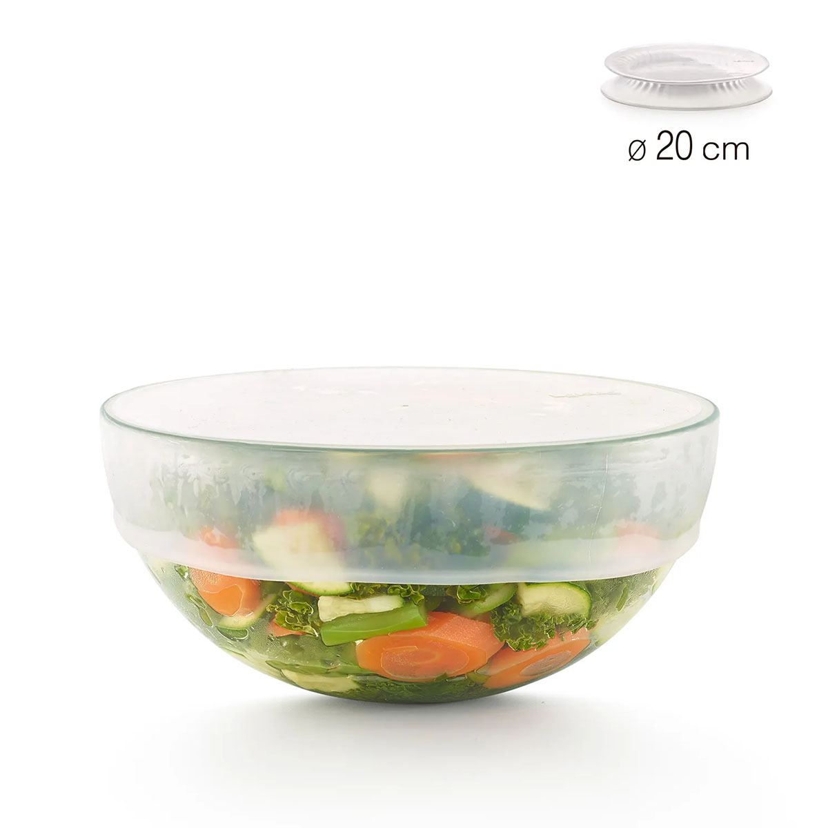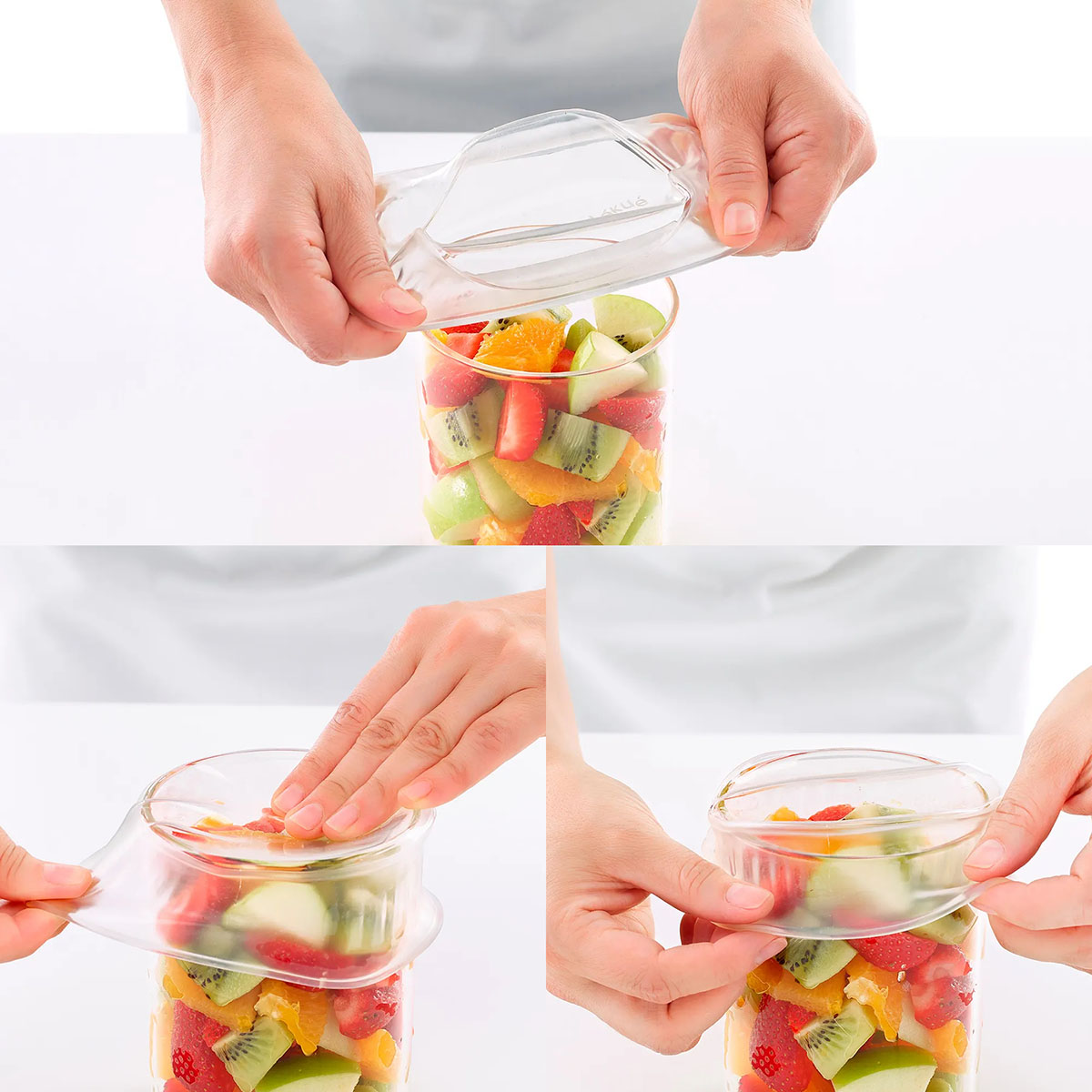 En raison de l’élasticité du produit, il s’adapte facilement aux récipients de différentes tailles et même aux moitiés de fruits ou de légumes. Un joint étanche est obtenu simplement en appuyant sur la partie supérieure.