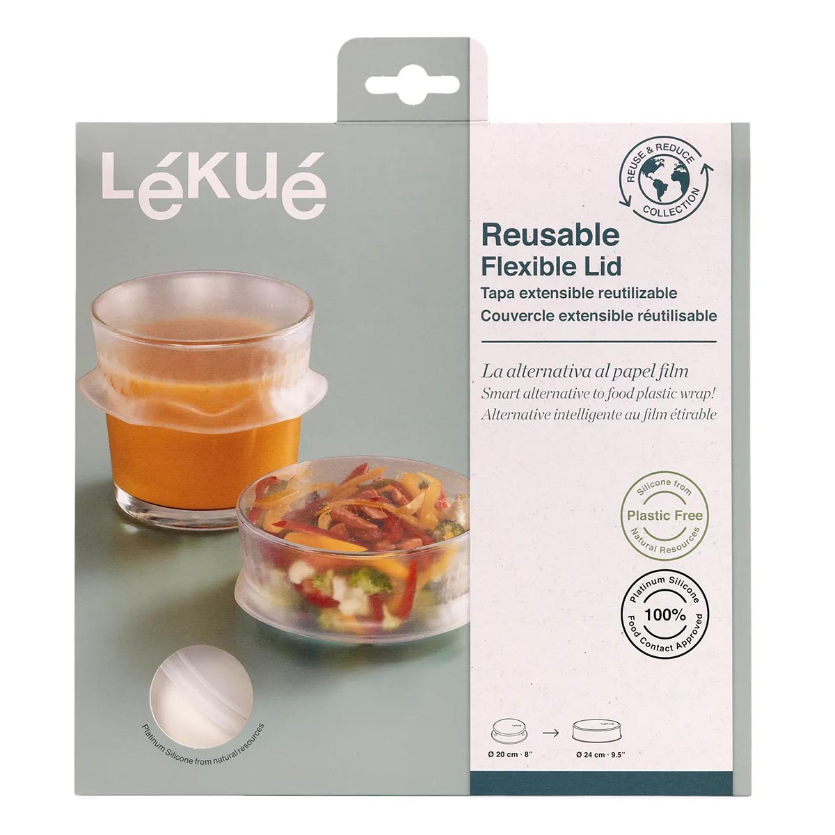 Le couvercle extensible réutilisable 100 % silicone platine permet de conserver facilement vos aliments au réfrigérateur, de prolonger leur fraîcheur et d’éviter la contamination d’odeurs.