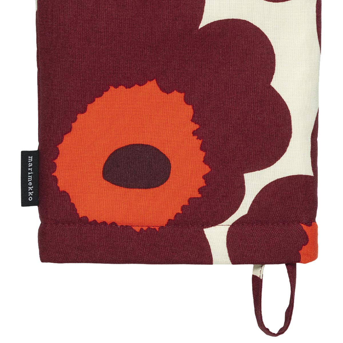 La mitaine de four à motif Pieni Unikko est en coton et imprimé à Helsinki. Elle est rembourrée et dotée d’une boucle de suspension.