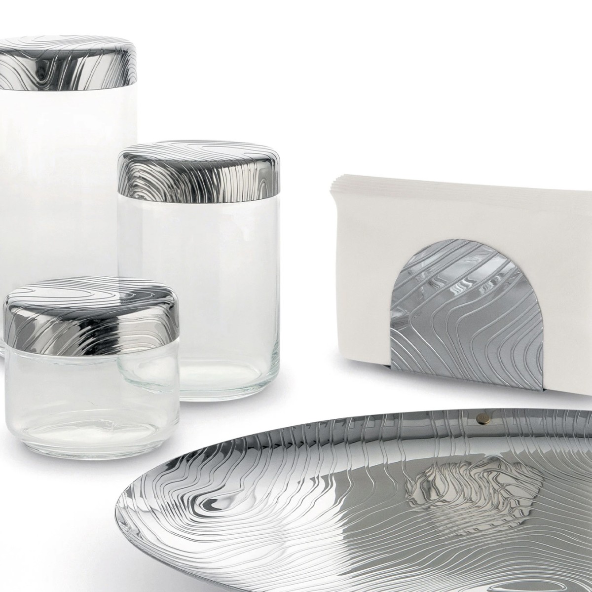 Le rythme de la décoration VENEER créée par Patricia Urquiola pour Alessi met l’accent sur les volumes en créant un agréable effet ondoyant.Le mouvement de la texture réinterprète les veines du bois de manière contrôlée, en créant ainsi presque une illusion d’optique, grâce aux lignes fluides qui parcourent la surface.