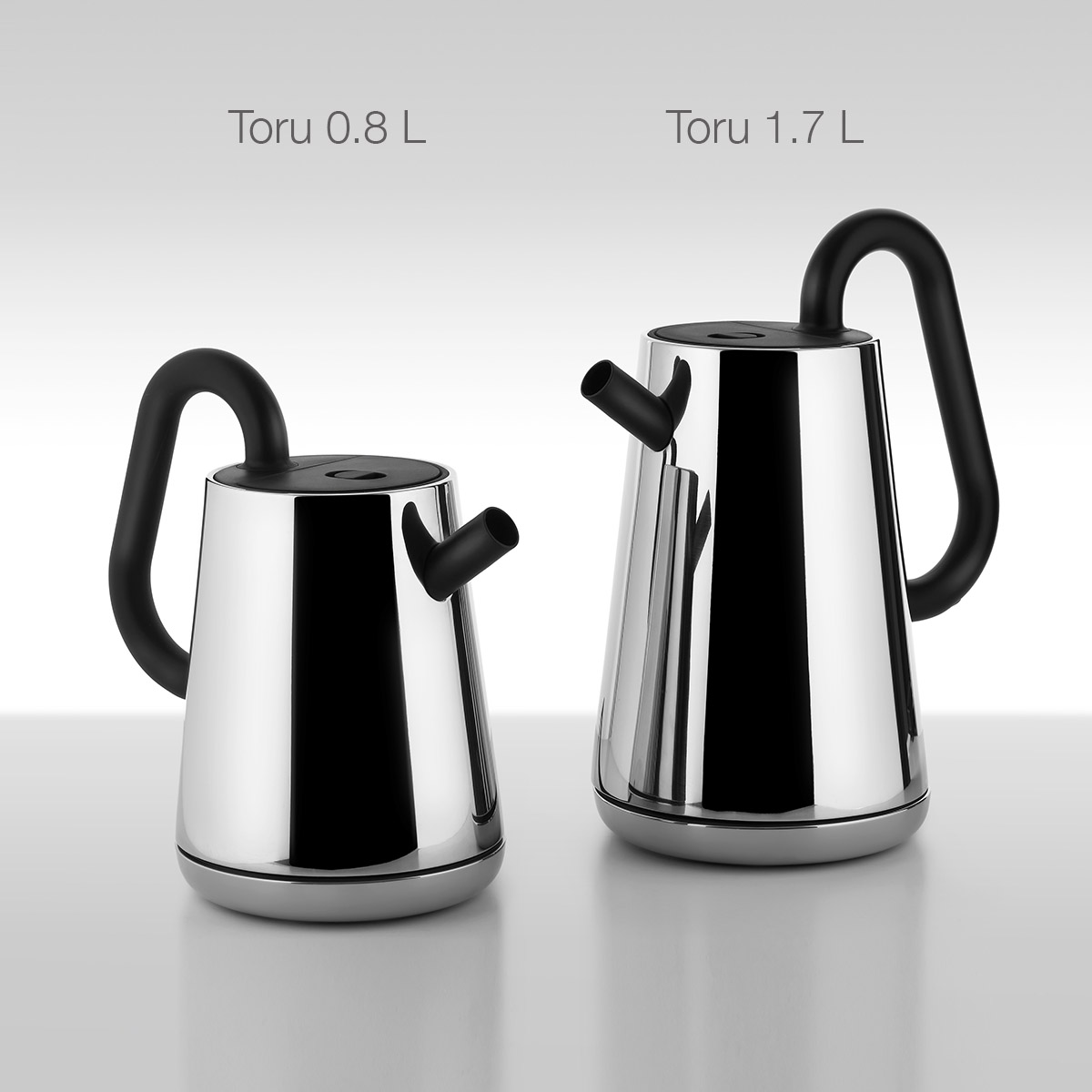 La bouilloire électrique Toru, conçue par le Studio Nendo, exprime l’habileté et le savoir-faire de l’entreprise dans le travail de l’acier. Toru signifie “à travers” en japonais. Dans l’imaginaire conceptuel de l’auteur, la poignée devient un bec, en traversant ainsi, avec une note enjouée, le volume en acier du corps. Une approche à la fois ironique et intellectuelle de la composition qui adoucit le métal sans altérer son aura raffinée.