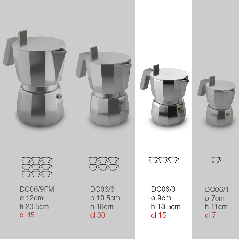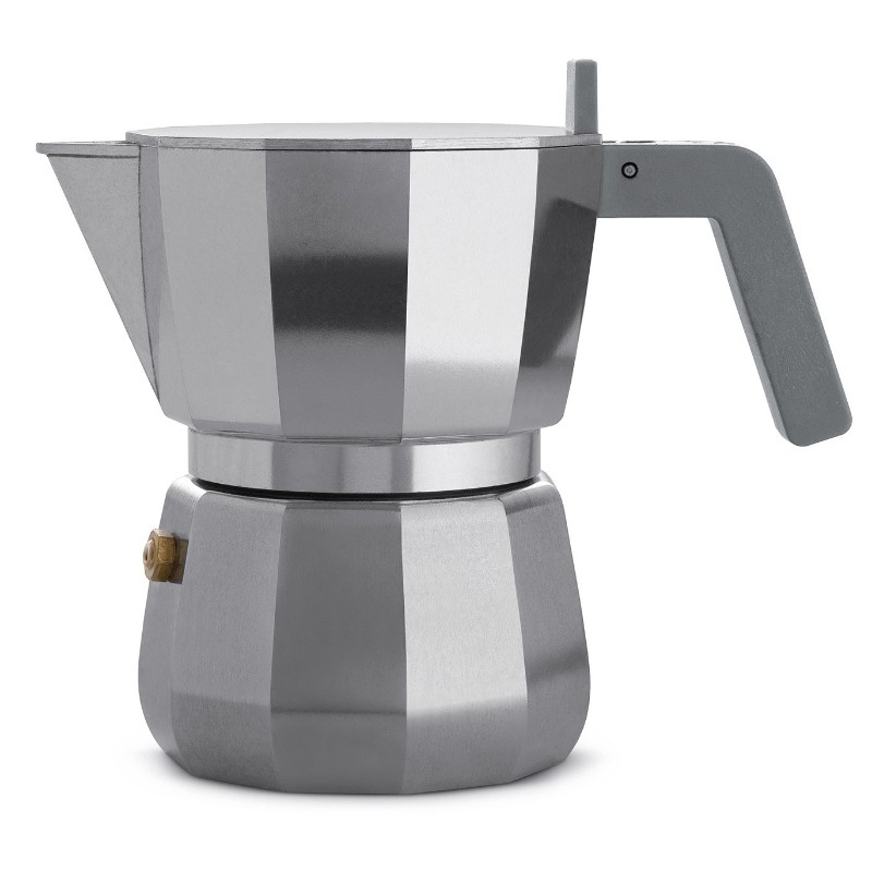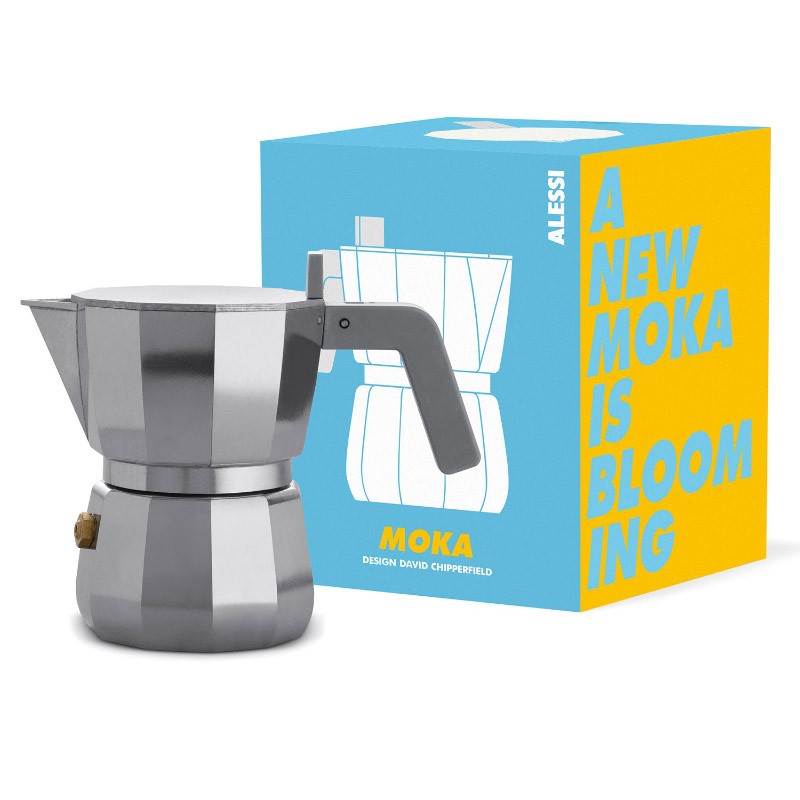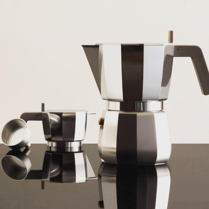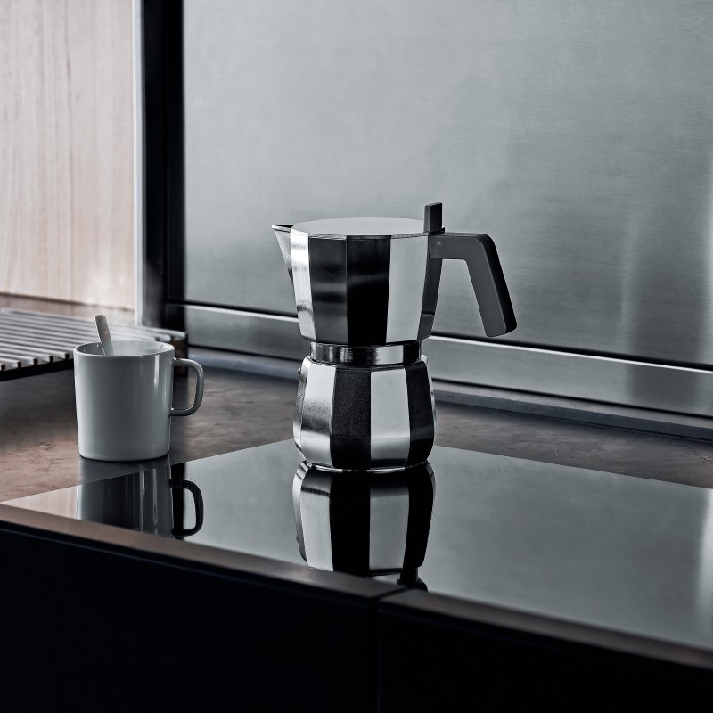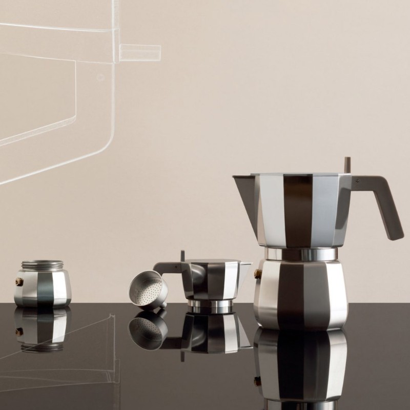 Contrairement aux cafetières Moka traditionnelles, le concept de Chipperfield pour Alessi comprend onze côtés et un couvercle plat. Les deux faces supplémentaires ont été ajoutées au volume pour renforcer la géométrie, mieux intégrer les proportions et insérer le bec, qui fait partie d’une des facettes. La nouvelle forme a également été créée avec une base plus incurvée.