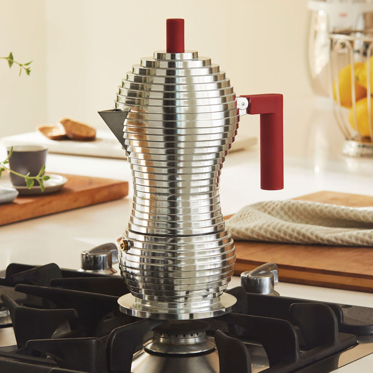 Réalisée en fusion d’aluminium, Pulcina présente une petite innovation conceptuelle, fondamentale pourtant : sa forme qui lui permet de préparer un café pratiquement parfait.