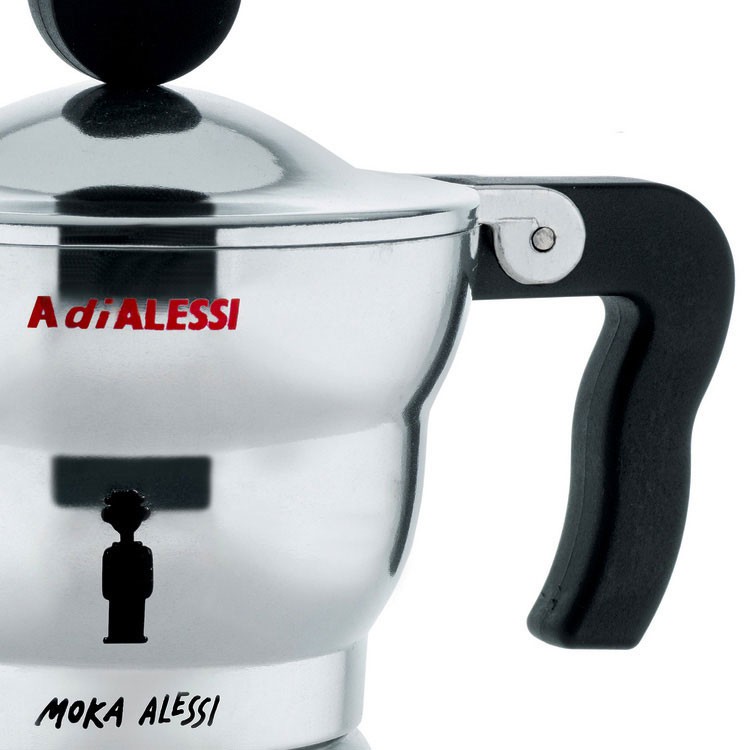 Cafetière espresso Alessi Moka en fonte d’aluminium. Poignée et pommeau en résine thermoplastique, noir. La cafetière ’ Moka Alessi ’, dessinée par Alessandro Mendini, est l’heureux remake de la première cafetière espresso du grand-père Alfonse.