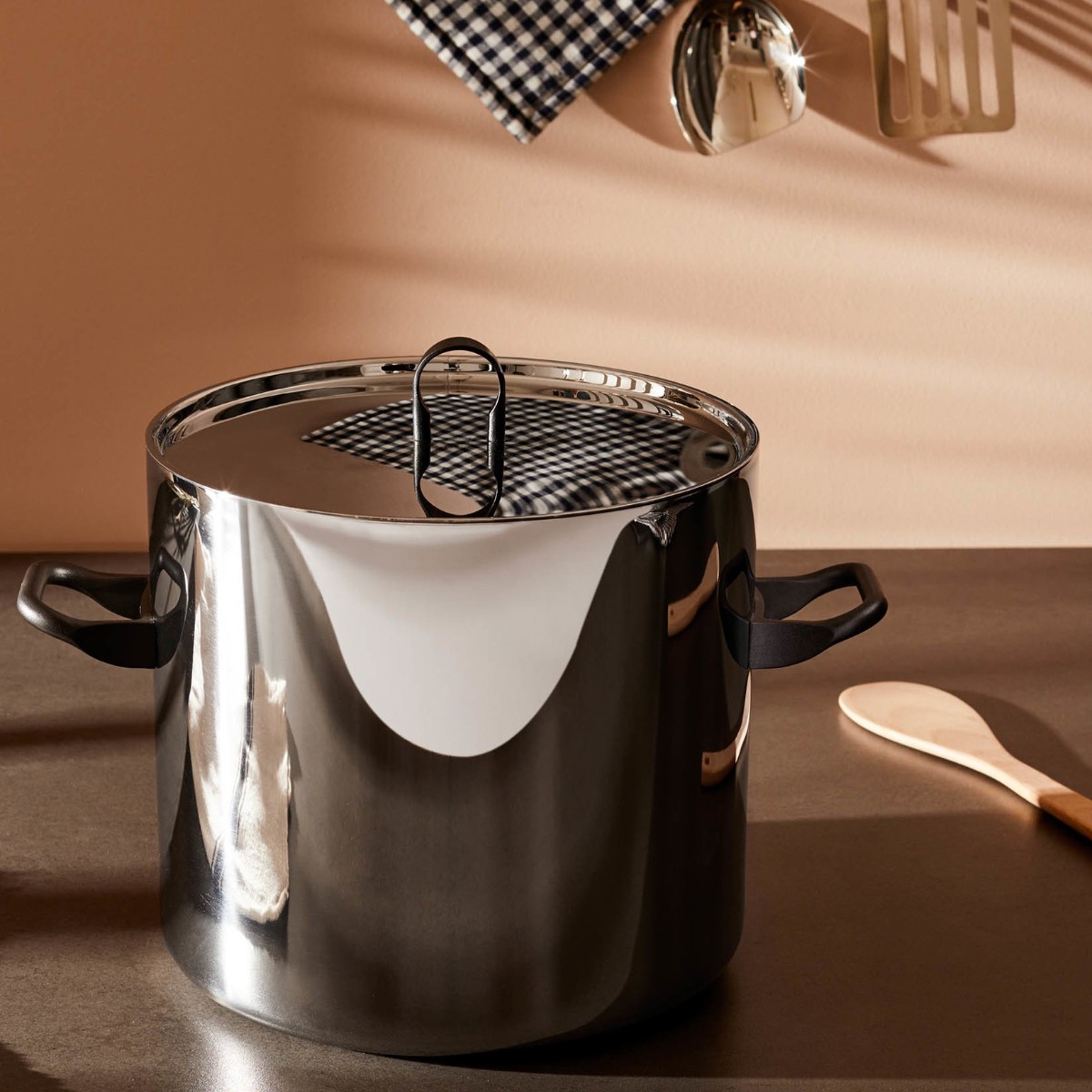 Conçu par Richard Sapper, le faitout de la série La Cintura di Orione a été créé avec l’aide du chef étoilé Gualtiero Marchesi. De forme cylindrique, il est réalisé en acier inox 18/10 multicouche (acier, aluminium, acier), qui garantit une distribution optimale de la chaleur sur toute la surface du faitout et permet son utilisation même sur des plaques de cuisson à induction. Idéal pour bouillir, mijoter ou cuire à la vapeur.