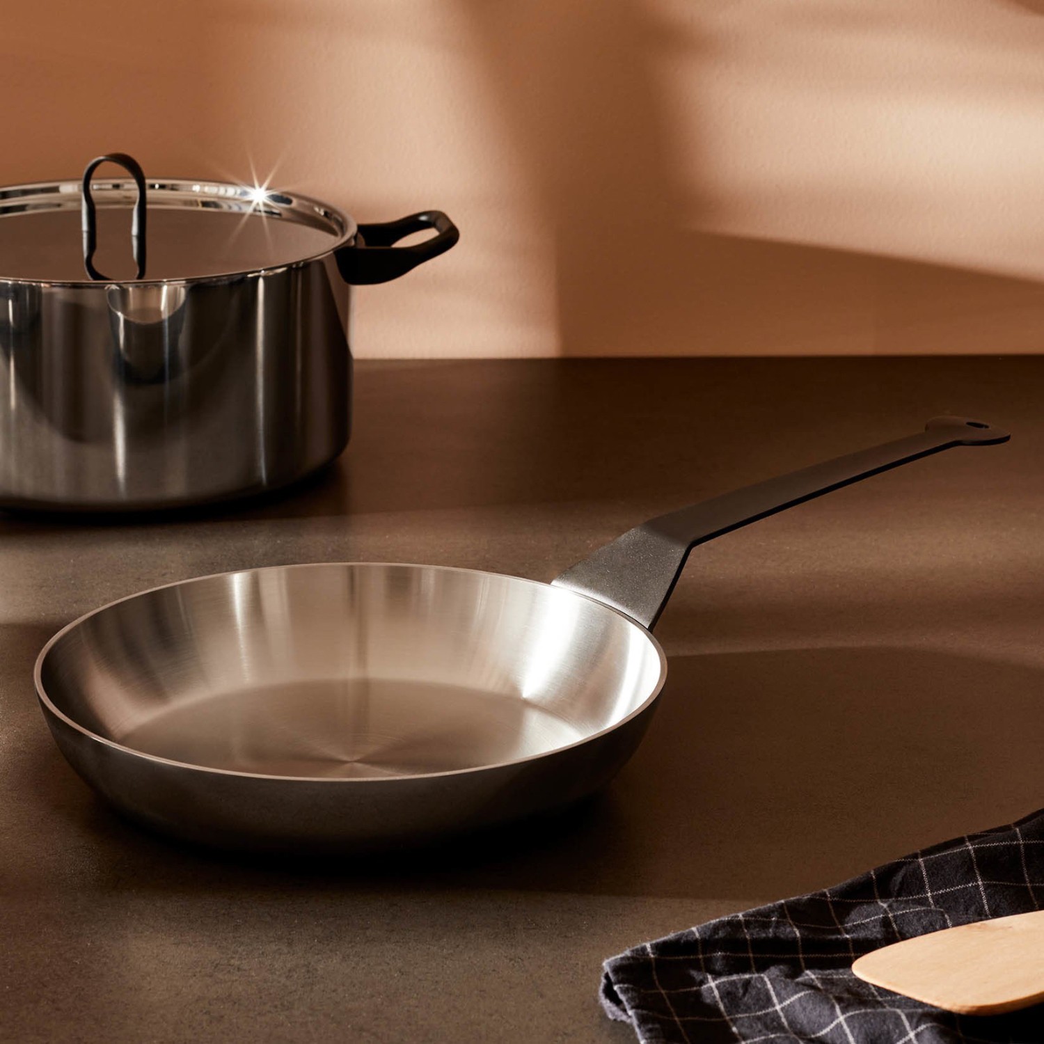 • Matières: épaisseur 3.5 mm, extérieur en acier AISI 430 magnétique + aluminium à forte épaisseur + intérieur en acier inoxydable 18/10. Manche en acier inoxydable 18/10 bruni