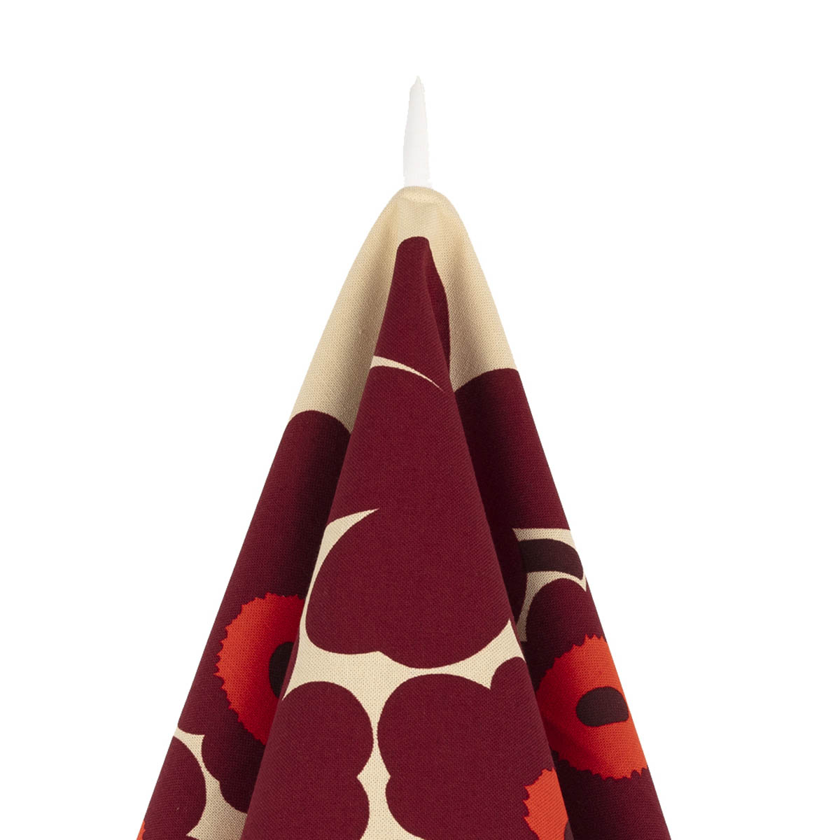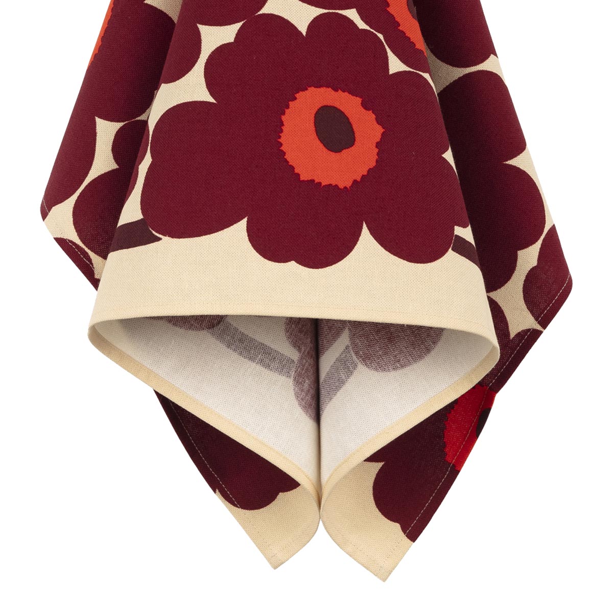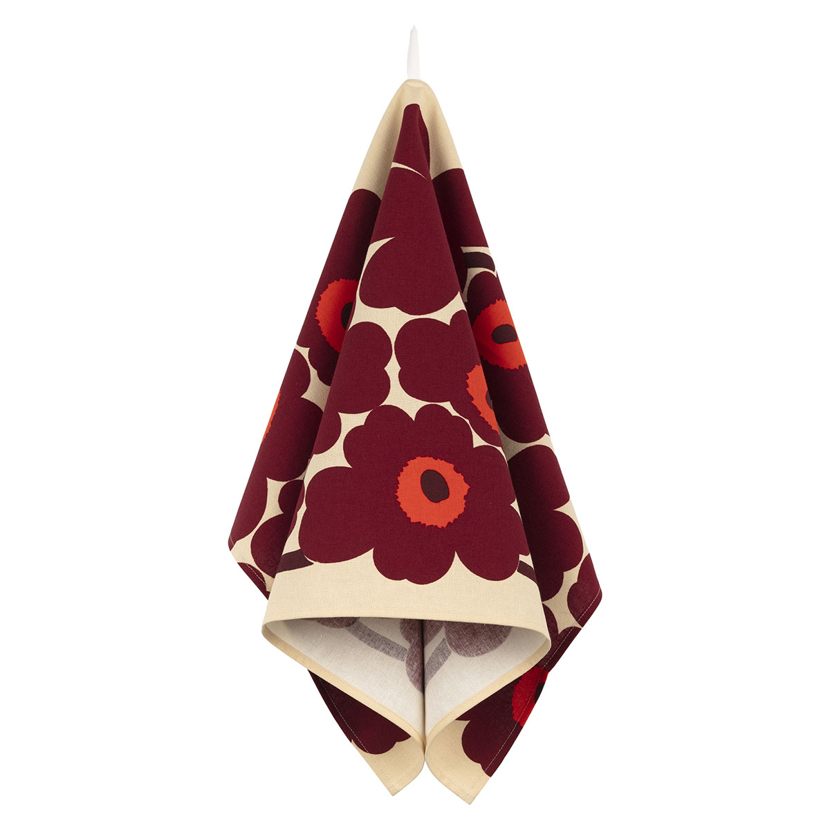 Ce torchon de 47x70cm arbore le motif Pieni Unikko en bordeaux et rouge sur fond vanille.