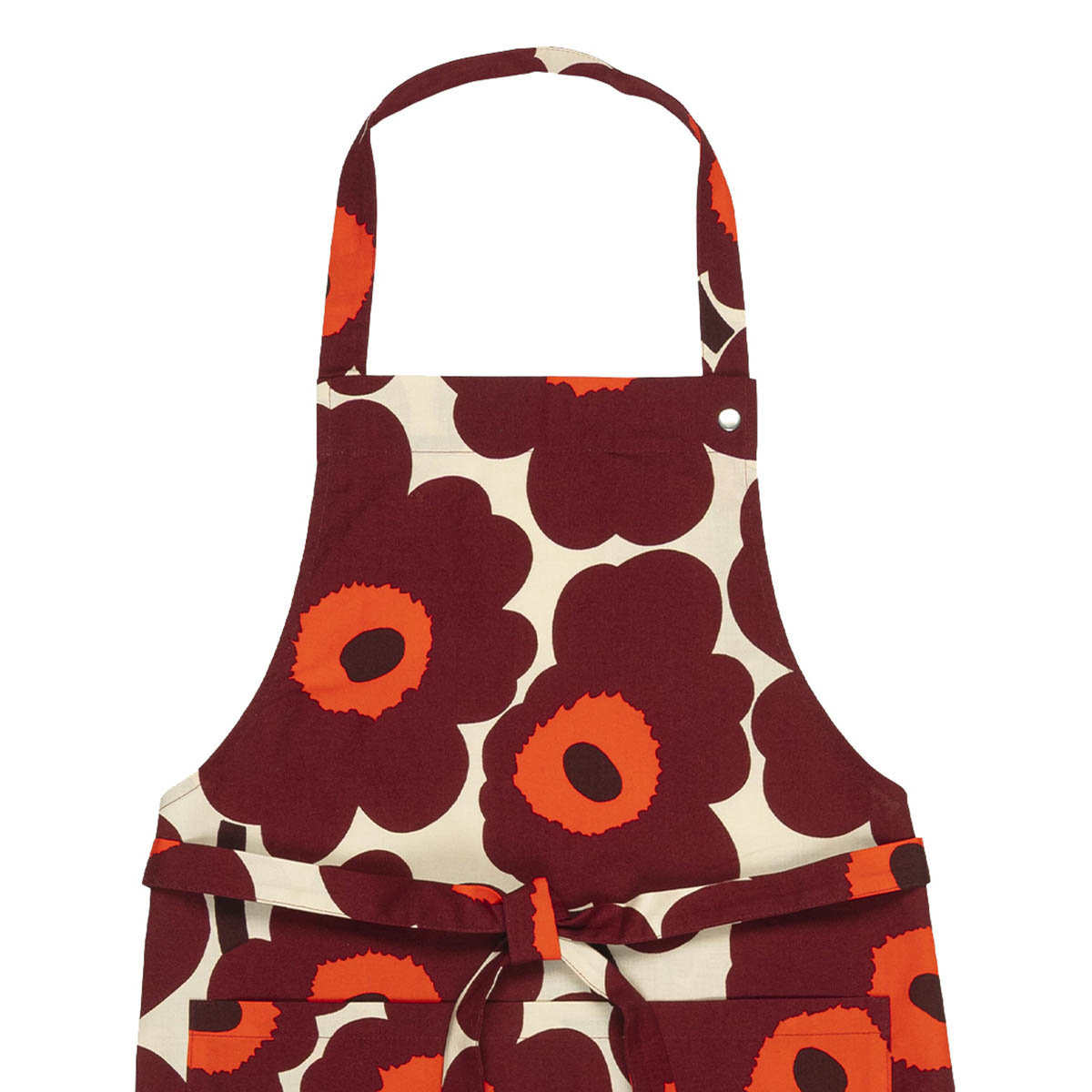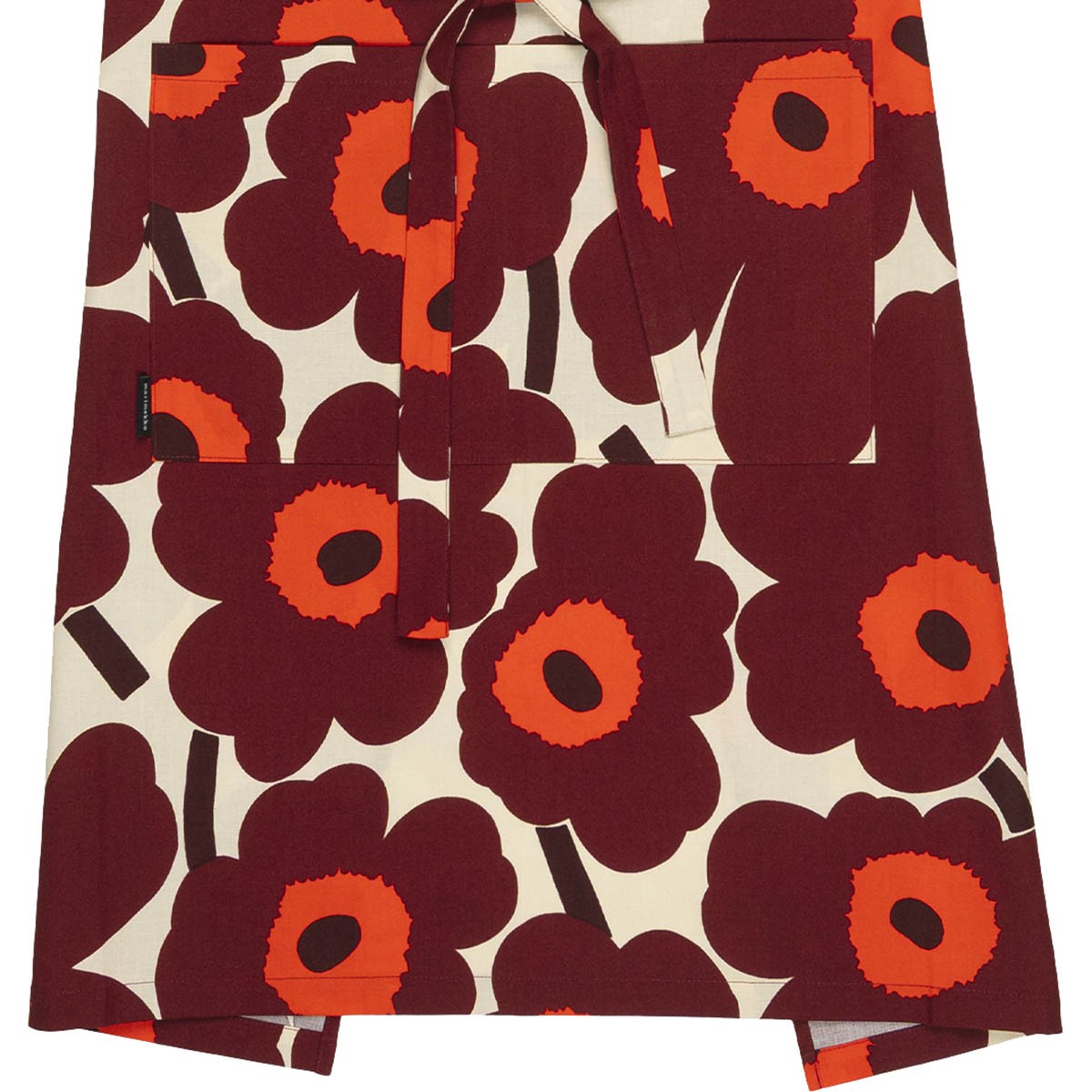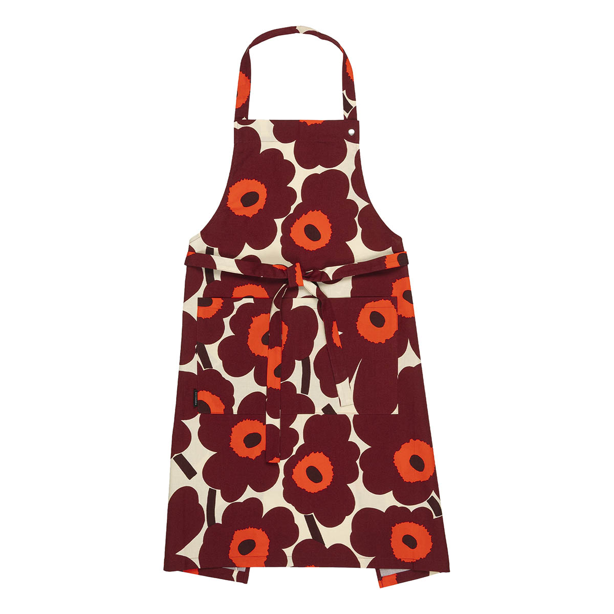 Ce tablier en coton possède une poche avant, une sangle réglable au niveau du cou et des bandes à la taille nouables dans le dos. Il arbore le motif Pieni Unikko, imprimé à Helsinki.