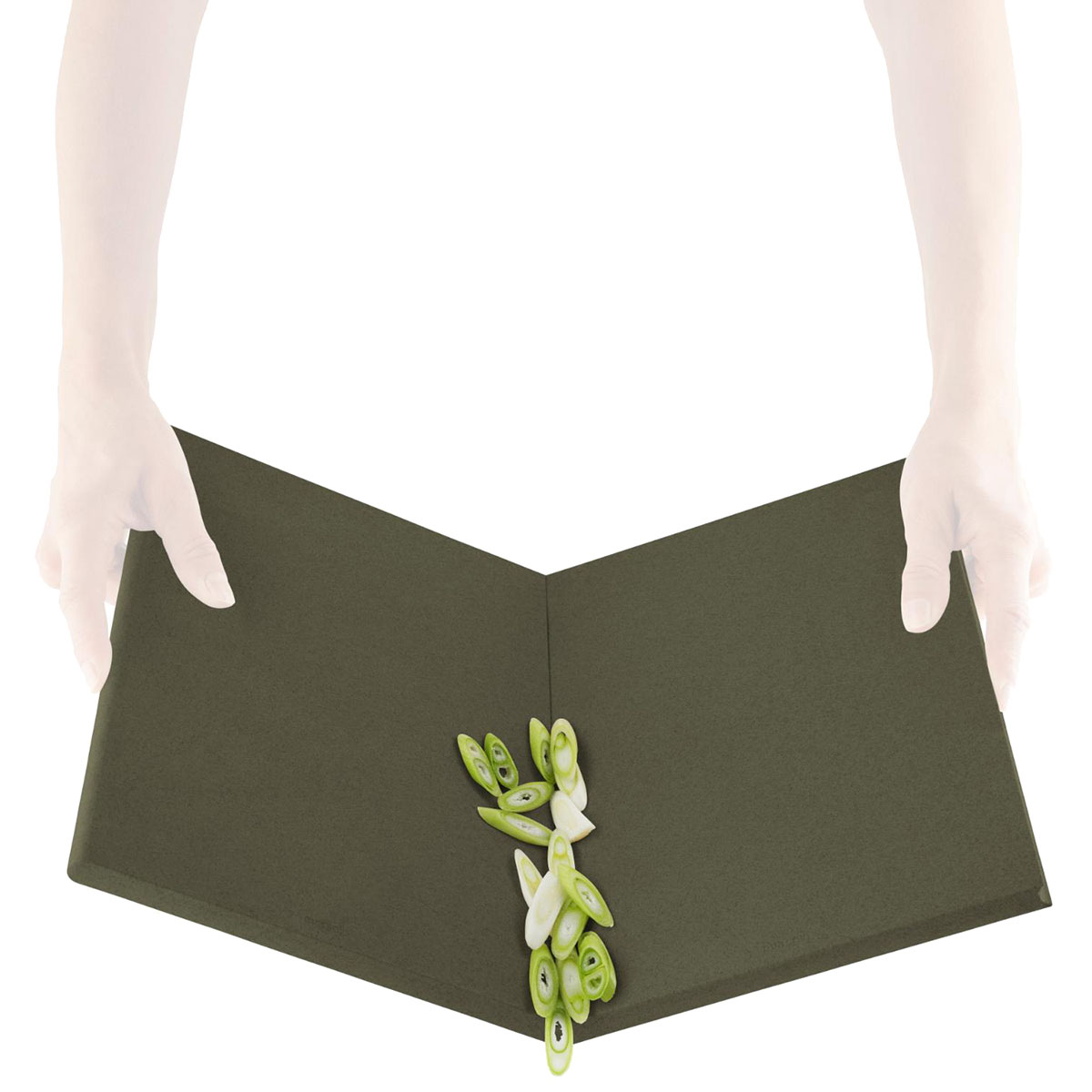 Assemblez les deux planches à découper, puis pliez-les en deux et vous pouvez ajouter des légumes tranchés, etc. dans une casserole ou une casserole sans rien renverser.