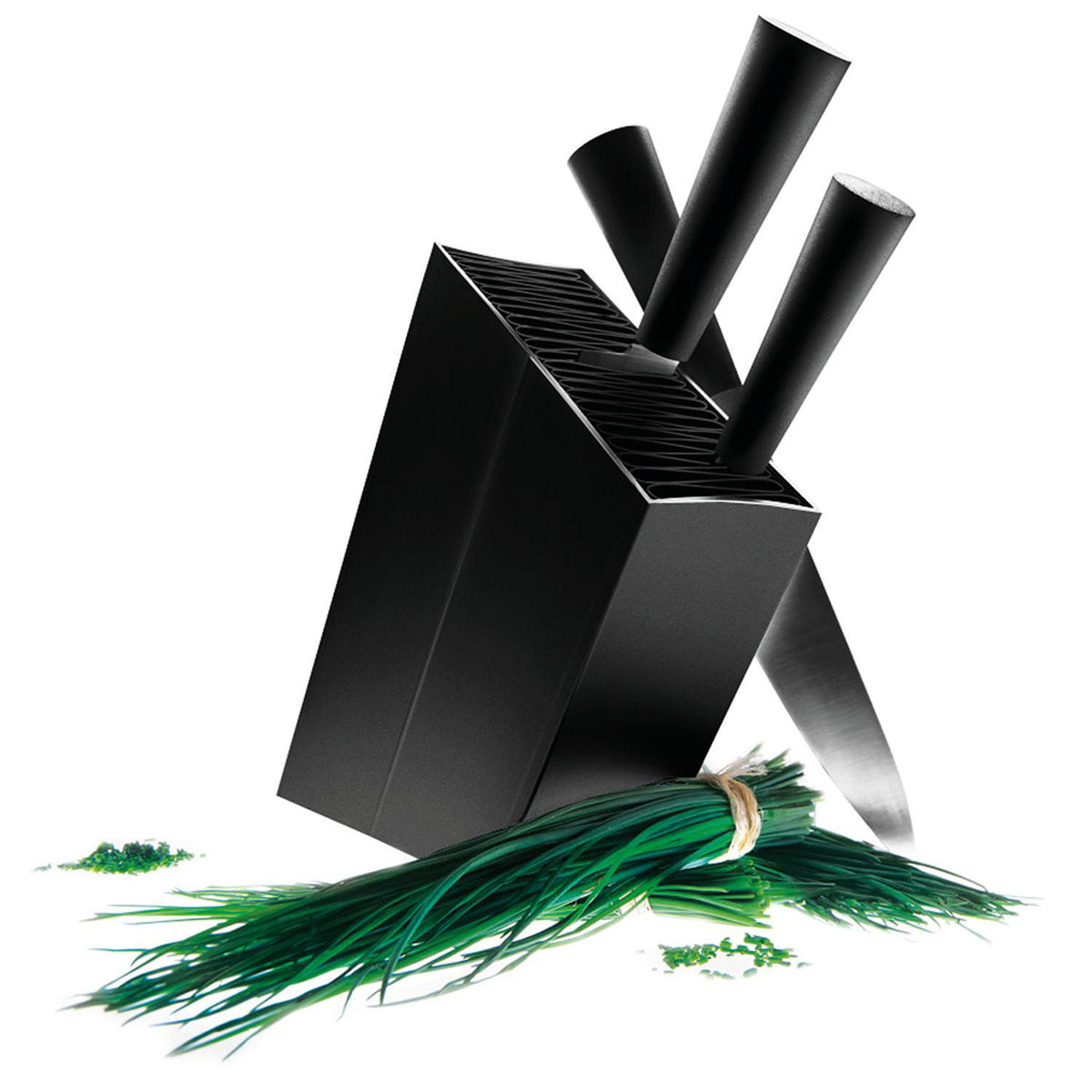 Convient à tous les types de couteaux et à de nombreux ustensiles de cuisine. Boîtier en aluminium noir avec insert en plastique lamellaire, amovible pour le nettoyage. Les lamelles passent au lave-vaisselle, le boîtier en aluminium est à laver à la main.