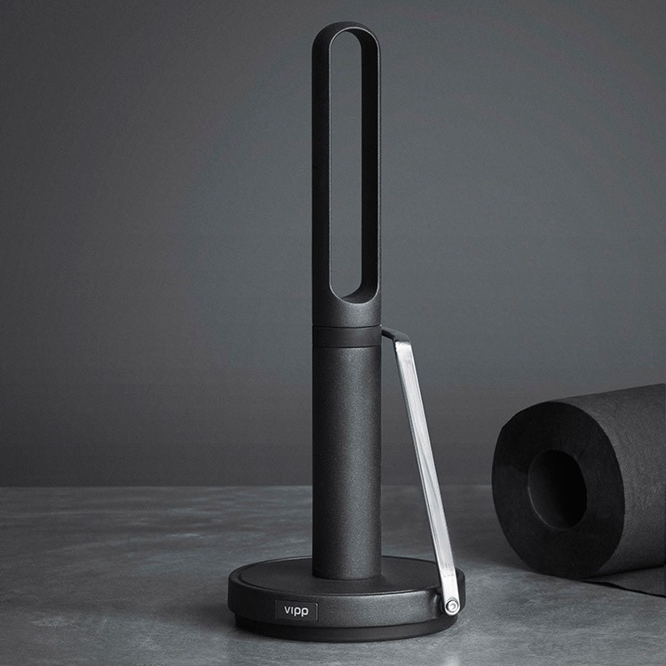 Un revêtement par poudre confère la couleur noire Vipp unique à l’axe avec poignée intégrée ainsi qu’à la base.