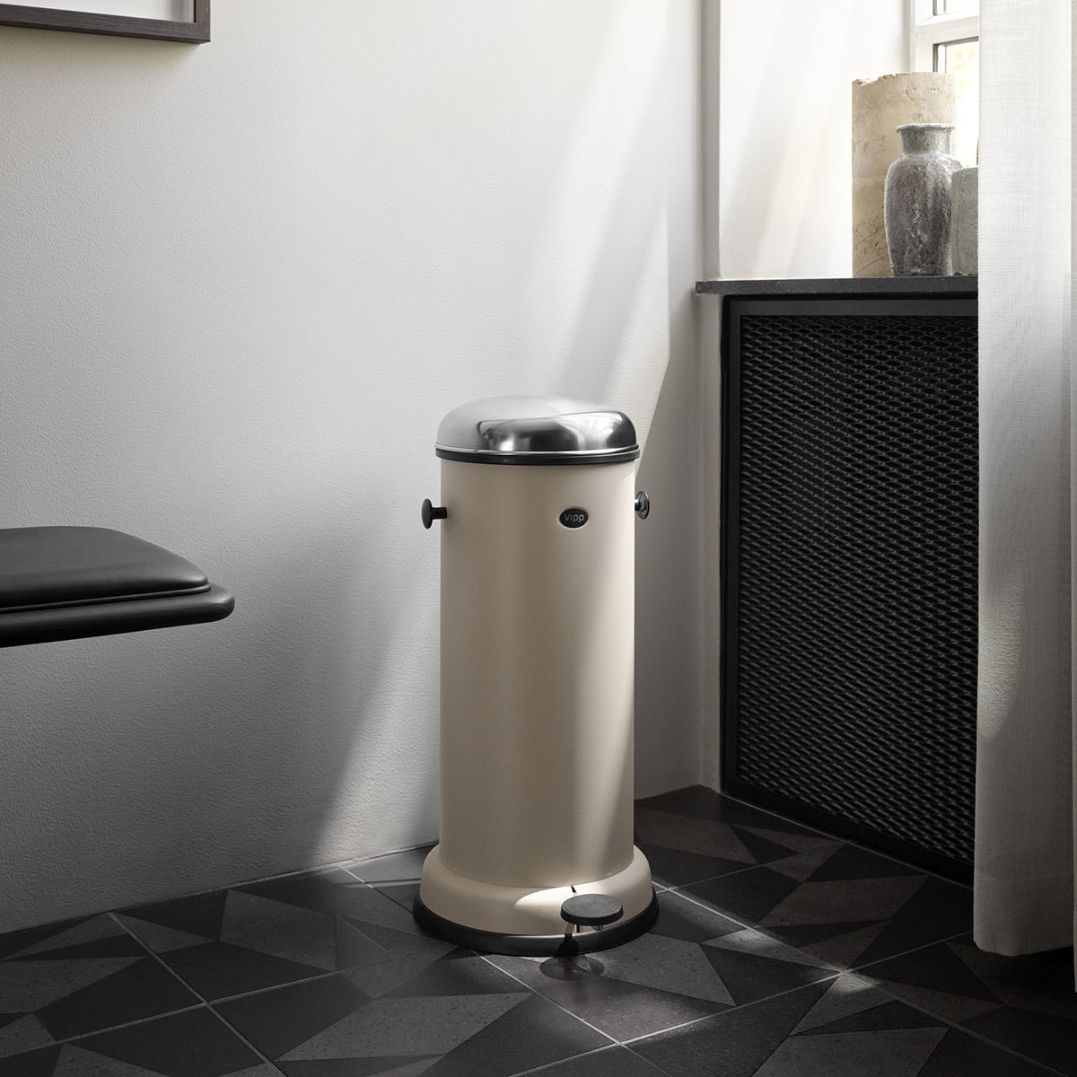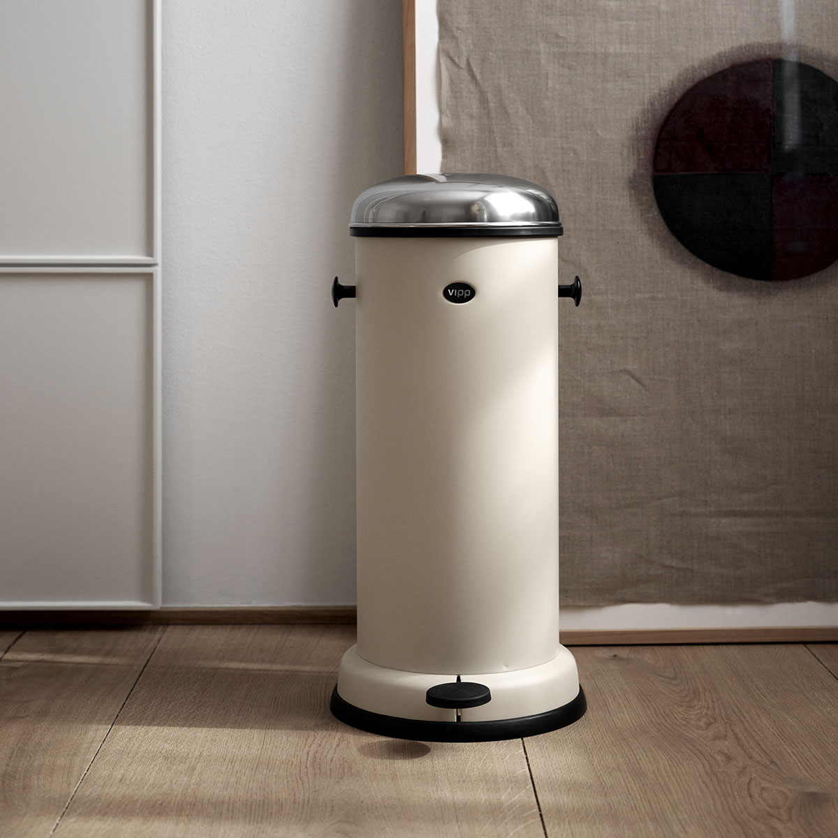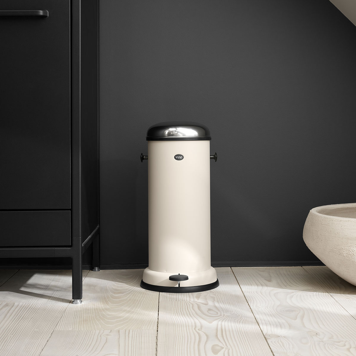 La poubelle à pédale Vipp 16 est munie d’un couvercle en acier inoxydable avec un mécanisme amortisseur qui permet au couvercle de se refermer en douceur et sans bruit. Un anneau en caoutchouc garantit l’étanchéite.