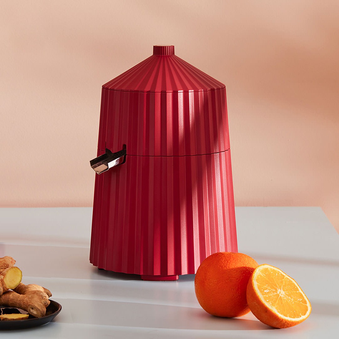 Le couvercle protège la zone de pressage de la poussière ou autre lorsque le presse-agrumes n’est pas utilisé. Le presse-agrumes Alessi PLISSÉ est équipé d’un démarrage et d’un arrêt automatiques: il suffit de placer les agrumes coupés en deux sur la pointe rainurée, en appliquant une légère pression pour que le presse-agrumes s’active – en interrompant la pression, il s’éteint.