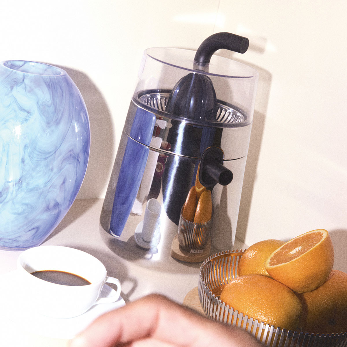 Le presse-agrumes Toru se compose de deux parties raffinées et minimalistes : un corps en acier inoxydable et un couvercle transparent. Toru signifie “à travers” en japonais, et dans ce presse-agrumes, le détail caractéristique de la collection – un élément noir semblant traverser l’appareil de part en part – donne l’impression d’entrer par le couvercle sous la forme d’une poignée, pour ressortir du corps en acier et faire office de bec verseur.