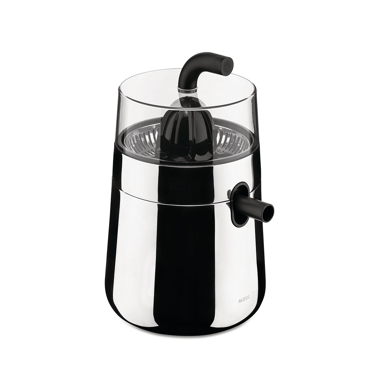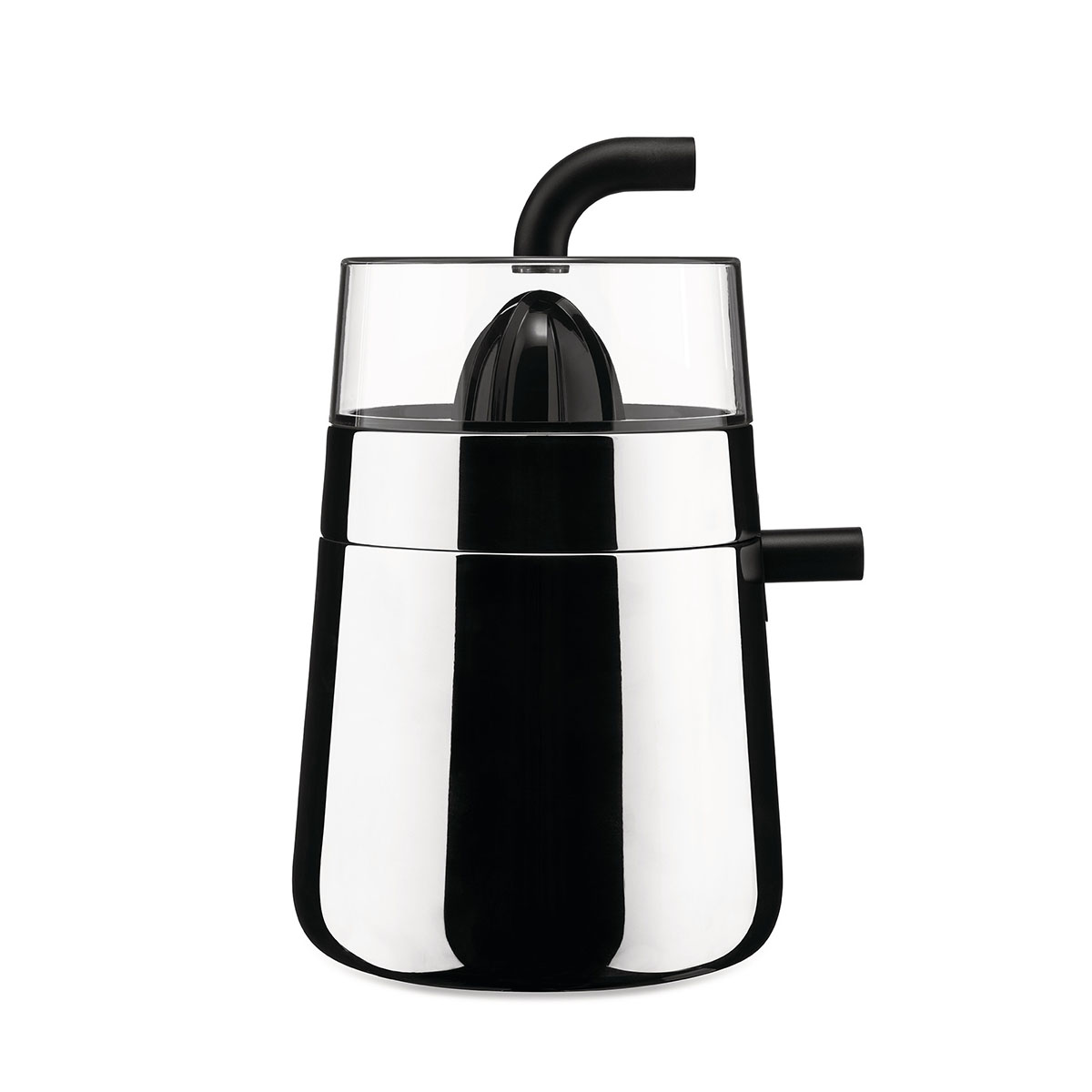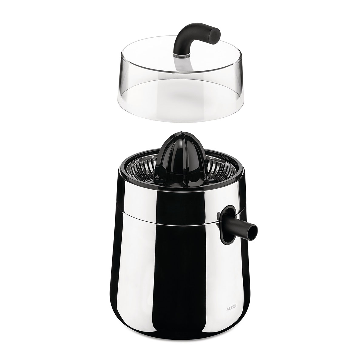 Presse-agrumes en acier inoxydable 18/10 poli et résine thermoplastique noire, composé d’un couvercle, d’un cône de pressage, d’un élément filtrant, d’un récipient avec bec en résine thermoplastique et d’un boîtier de moteur dans la base duquel le câble peut être enroulé.