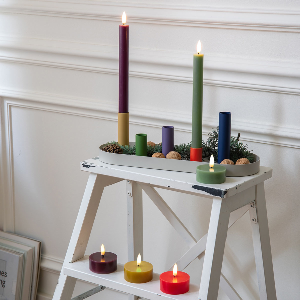 Idéal pour le rebord de la fenêtre : le plateau ovale avec les 5 bougeoirs magnétiques s’adapte parfaitement aux surfaces étroites ou rectangulaires et peut être redécoré encore et encore selon votre humeur.