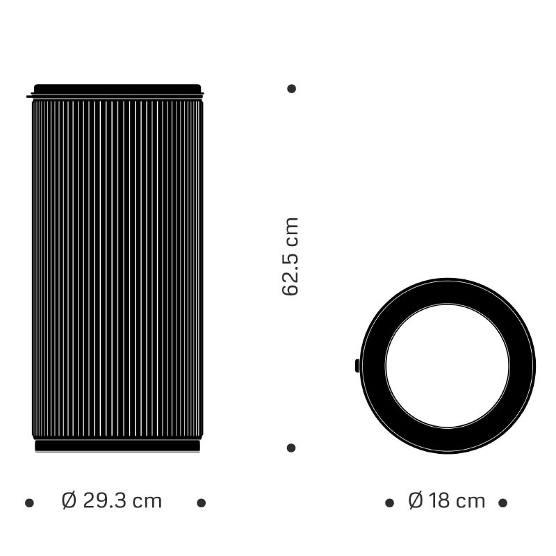 • Dimensions: diamètre 29.3cm, hauteur 62.5cm, diamètre de l’ouverture 18cm