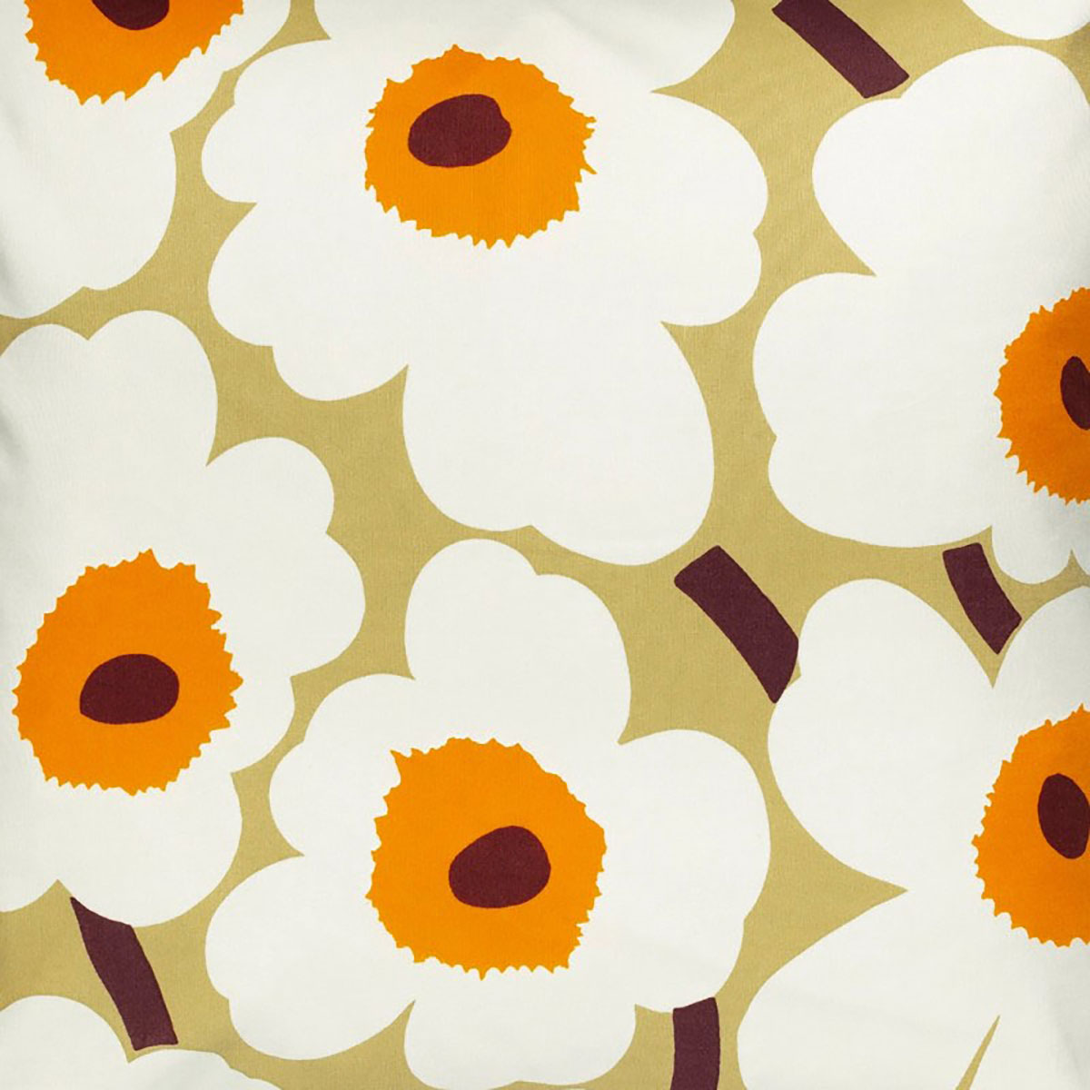 Cette housse de coton arbore le motif Pieni Unikko en caramel, crème, orange chaud.