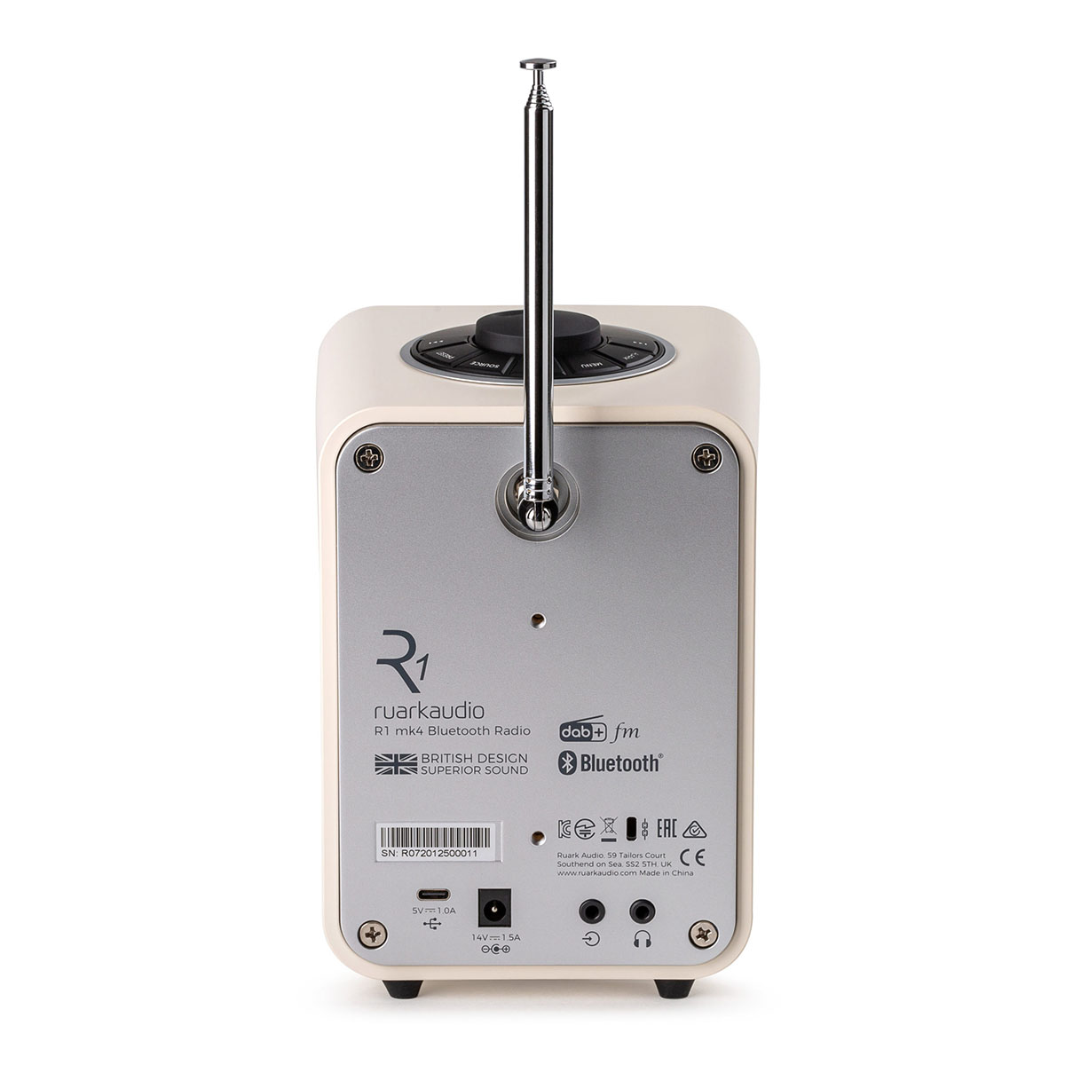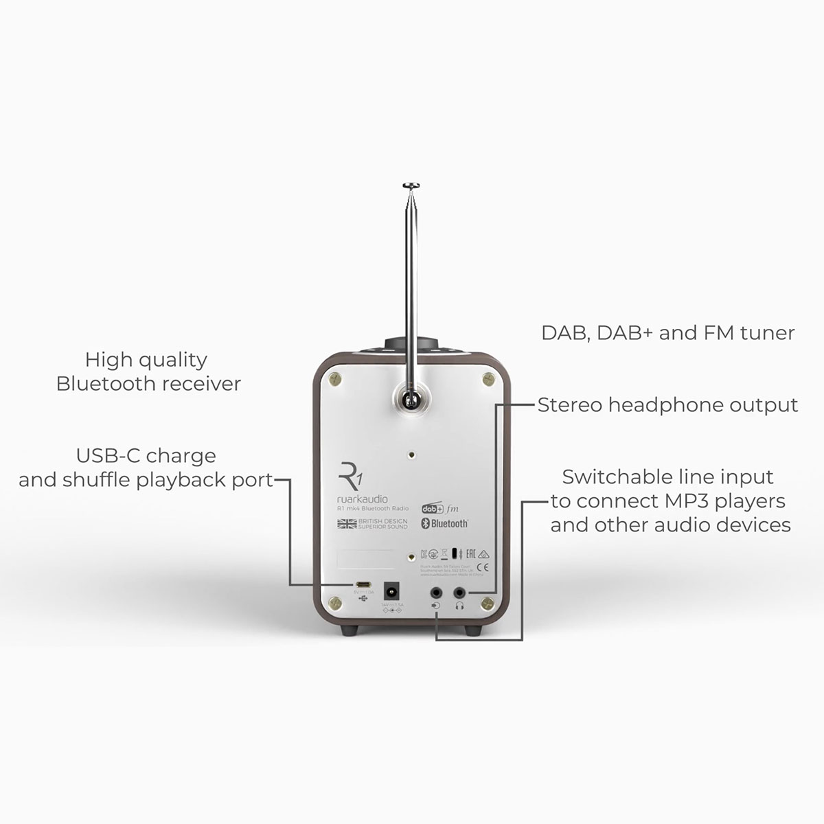 Une sortie casque ainsi qu’une entrée jack 3,5 mm sont présentes à l’arrière de la R1 mk4. Un port USB-C autorise la recharge d’un smartphone mais surtout, permet à la R1 mk4 de lire les fichiers audios contenus sur une clé. Une télécommande permet de piloter votre radio R1 mk4 à distance.