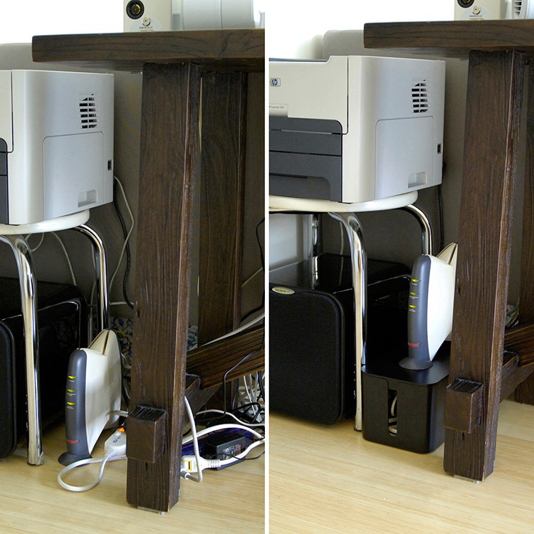 Cablebox est dessiné pour s’adapter à de nombreuses formes et tailles de multi-prises, elle a une sortie à ses deux extrémités et offre plein de place pour les excès de câbles à l’intérieur. Cablebox est assez large pour déposer sur le dessus d’autres appareils comme par exemple les modems. Cablebox est munie de 2 pieds anti-dérapants en caoutchouc qui lui confèrent une bonne adhérence même sur des surfaces lisses.