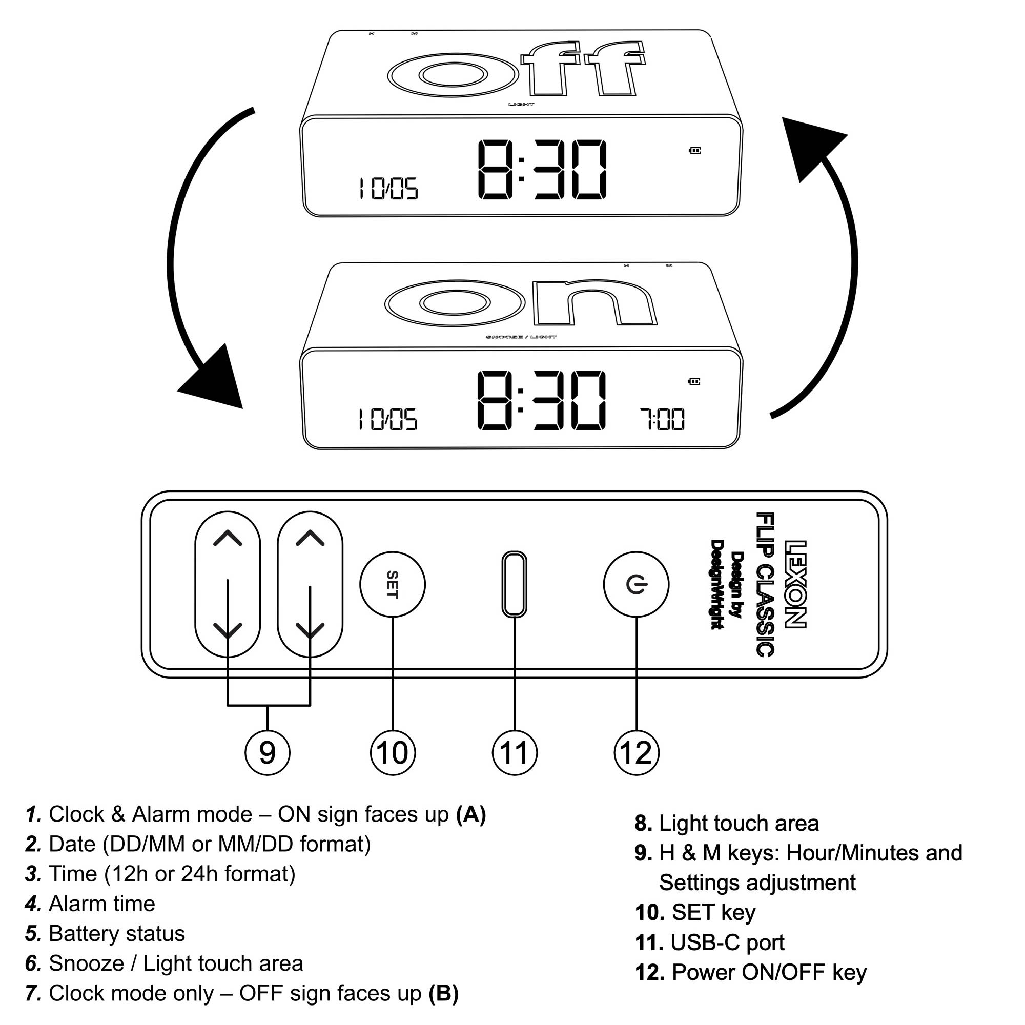 Un design simple pour une expérience ludique: le réveil rechargeable Lexon Flip est amusant et doté de deux faces (ON/OFF). Le réveil doit être tourné d’un simple geste pour être activé ou désactivé. Grâce à sa commande tactile intégrée, il vous suffit de le toucher pour déclencher la lumière de son écran LCD. De plus, Flip Classic comporte quelques boutons discrets à l’arrière pour régler le format heure/date, l’alarme et la luminosité de l’écran.