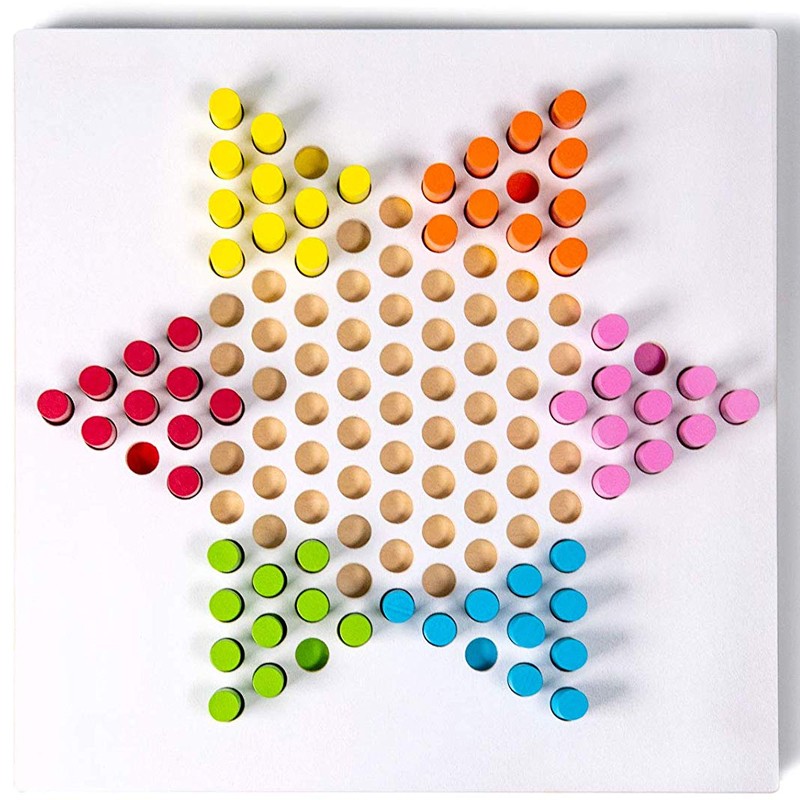 Le panneau est en bois multicouche et doté d’une surface peinte en blanc. La surface de jeu colorée est composée de trous cylindriques adaptés aux pièces de jeu peintes de même couleur.