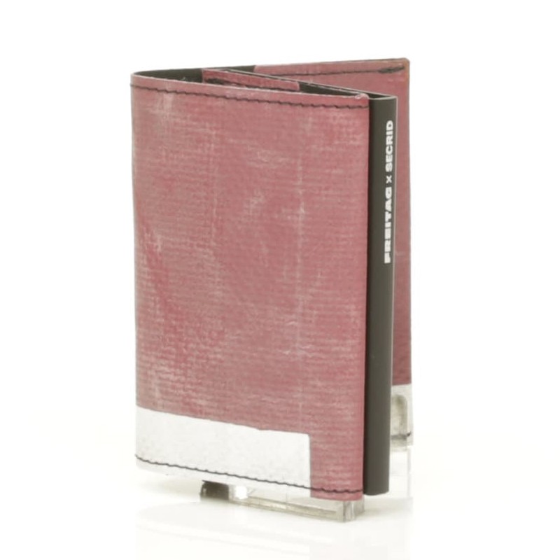 Son mécanisme fonctionne aussi avec une seule carte; l’étui FREITAG qui l’accompagne offre deux poches supplémentaires en bâche de camion pour accueillir chacune deux cartes, quelques billets et des pièces de monnaie.
