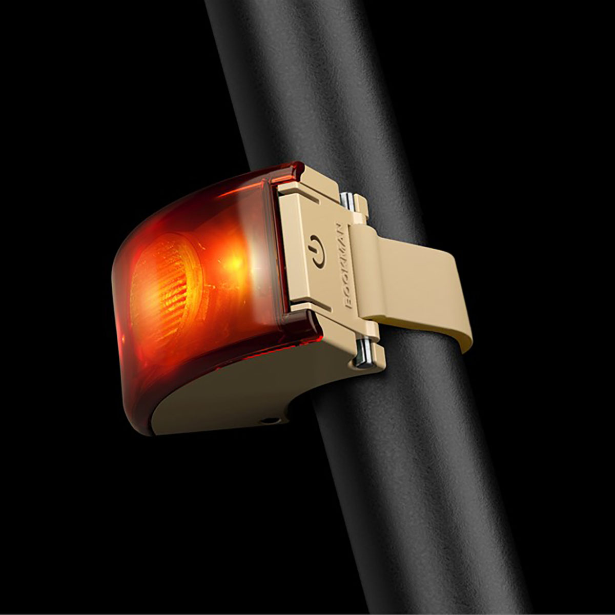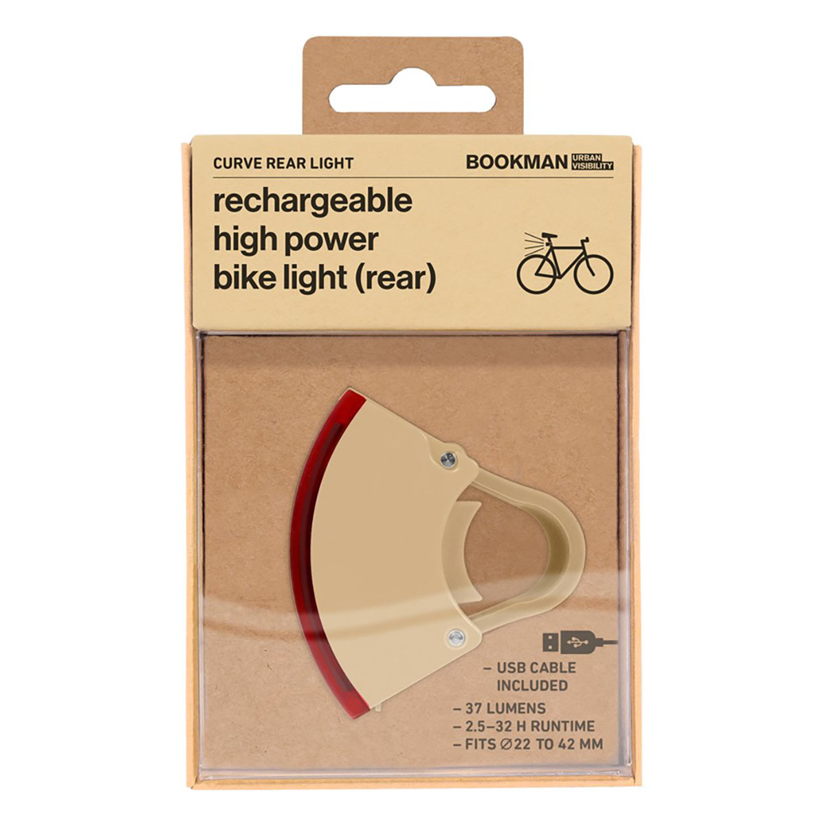Lampe arrière de vélo rechargeable Curve Light Rear Beige hautes performances de Bookman avec une luminosité allant jusqu’à 37 Lumen et une autonomie allant jusqu’à 32 heures.