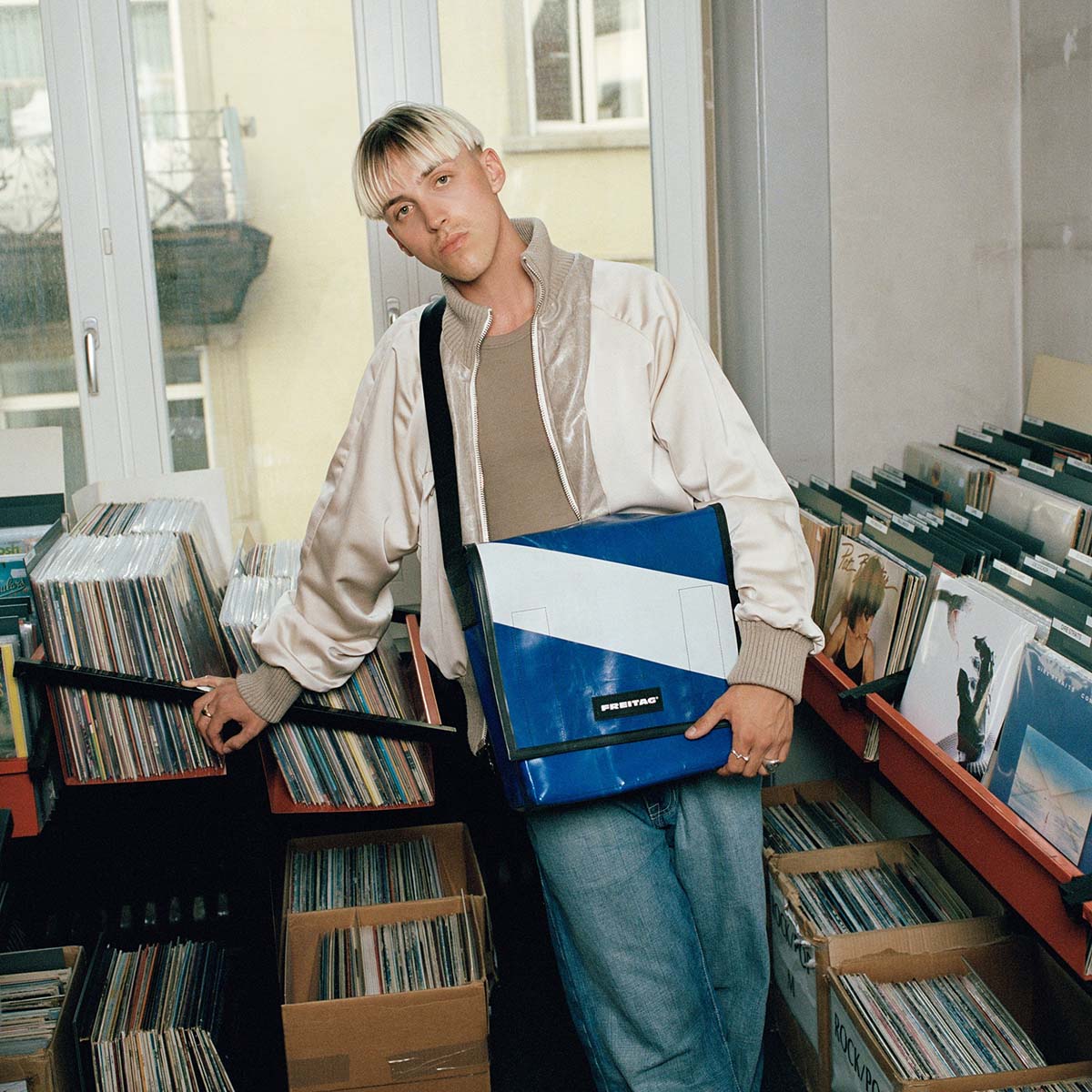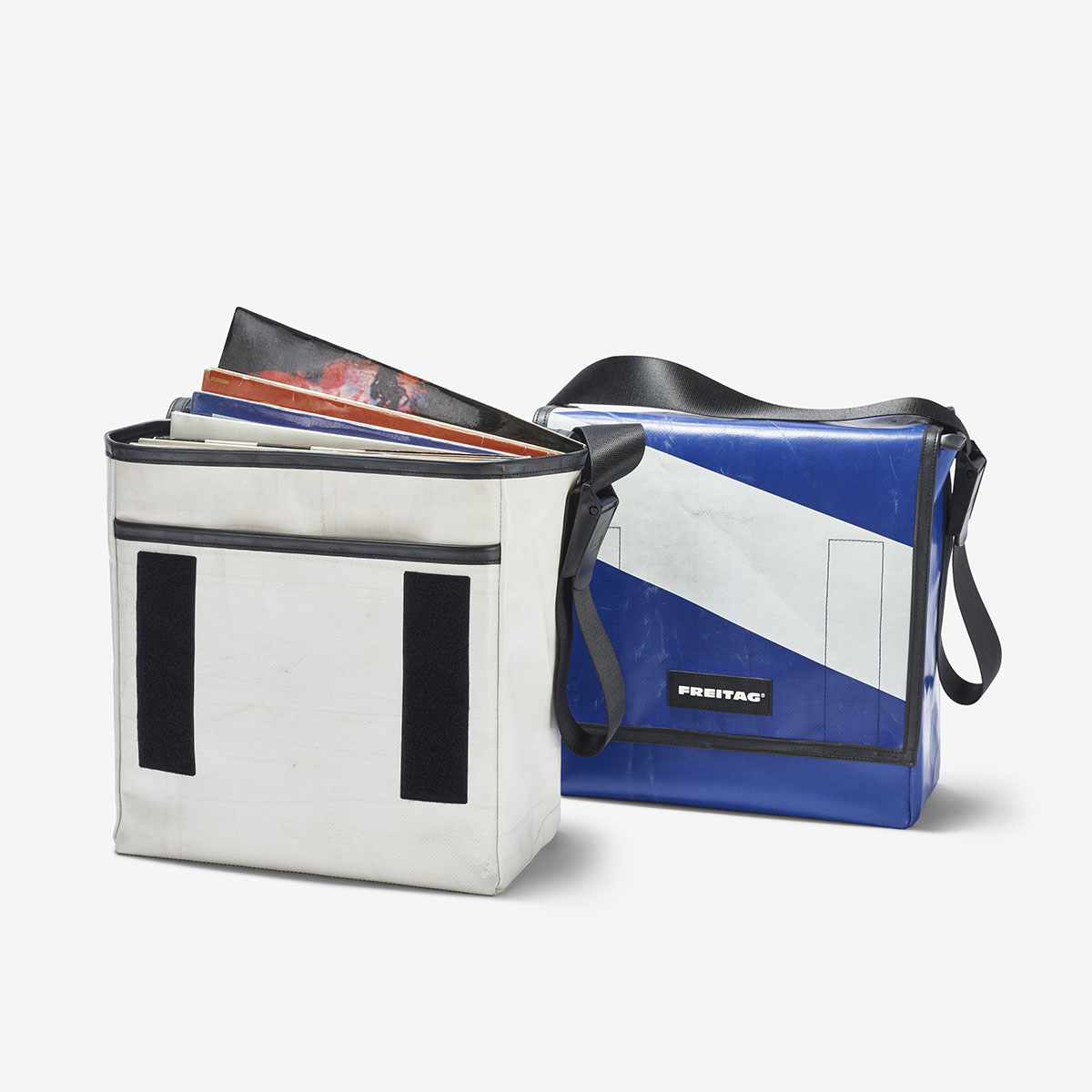 Le sac Messenger DJ carré classique fabriqué à partir de bâches de camion usagées. Pour les amateurs de vinyles et tous ceux qui aiment les sacs individuels, aussi larges que longs.