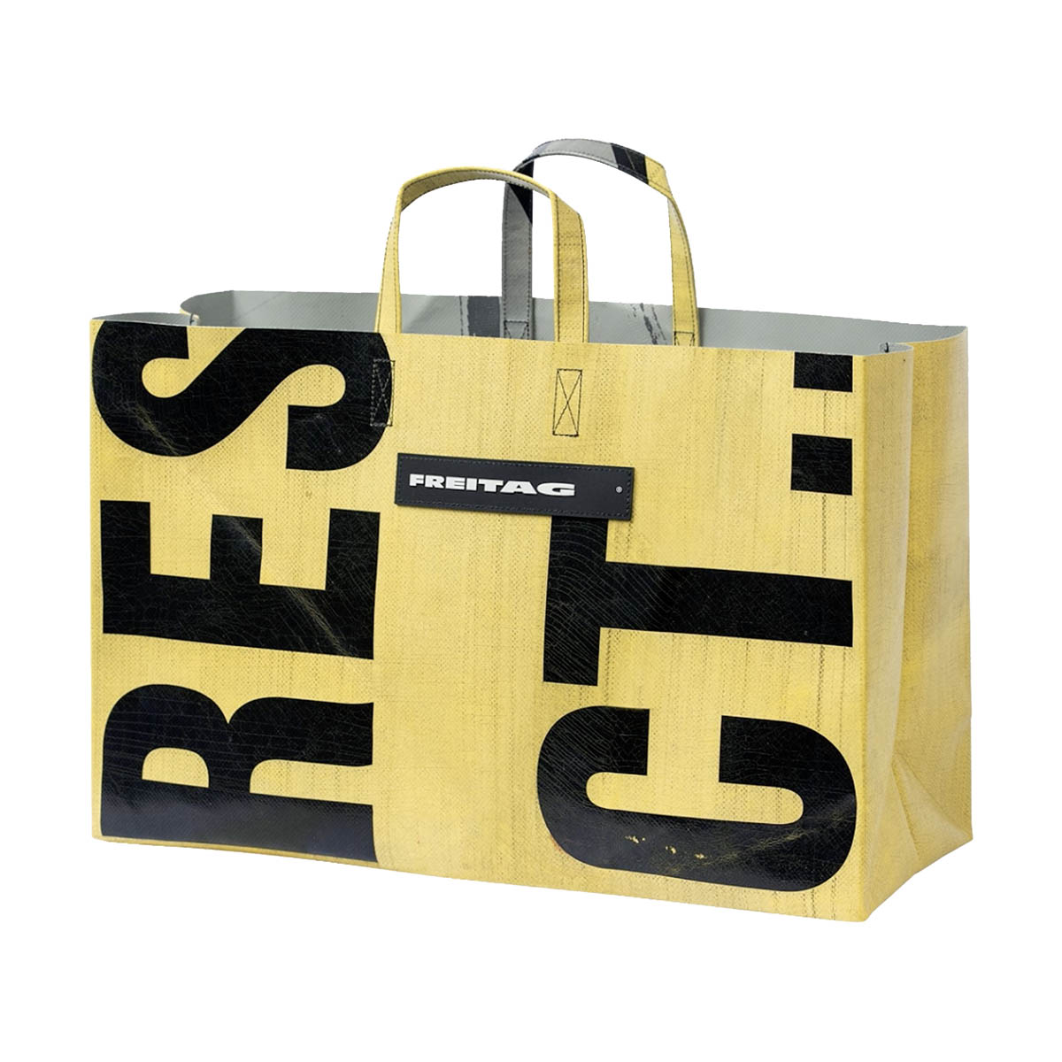 Chaque exemplaire FREITAG est une pièce unique conçue à partir de bâches de camion usagées. Le cabas est également pliable et extrêmement robuste.